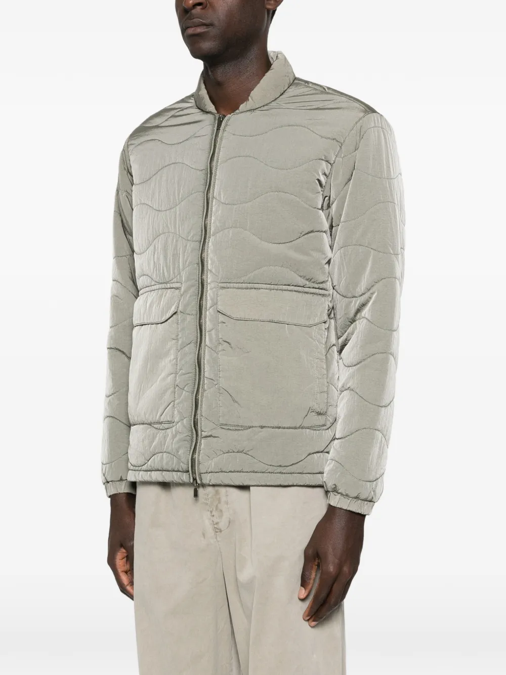 Зелёный с волнообразным узором, два накладных кармана спереди с клапанами, застёжка-молния спереди, эластичные манжеты, стойка-воротник