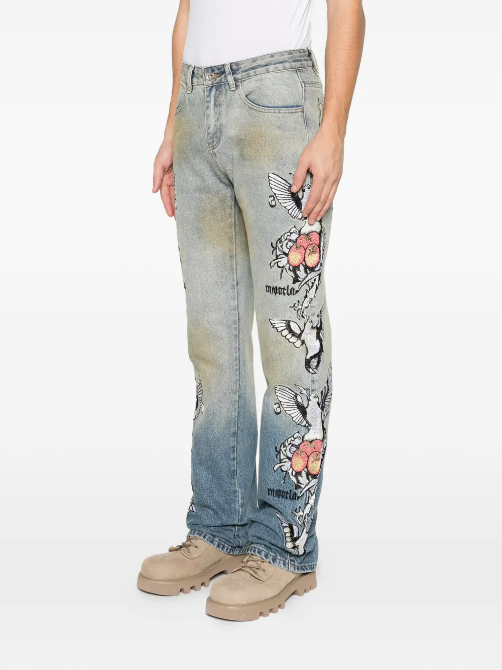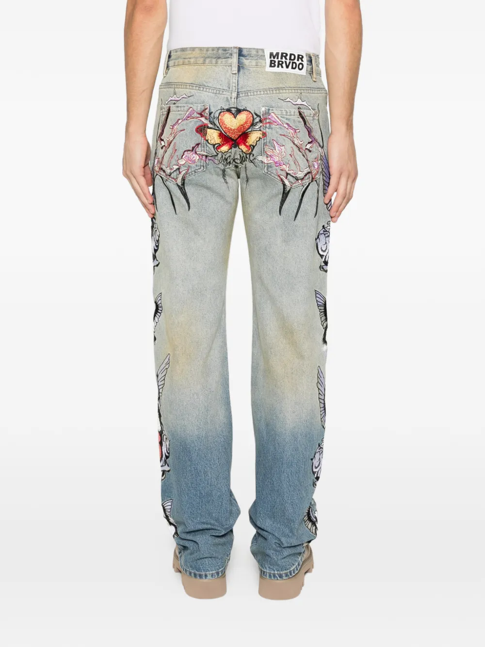 Деним с вышивкой, пять карманов, стандартная посадка, эффект потертости, прямые брючины