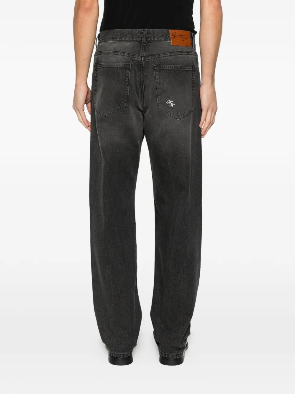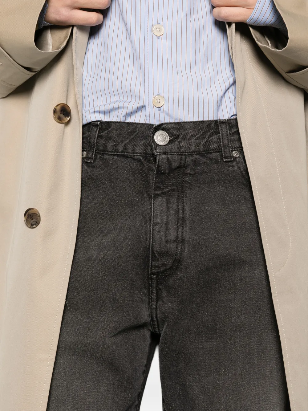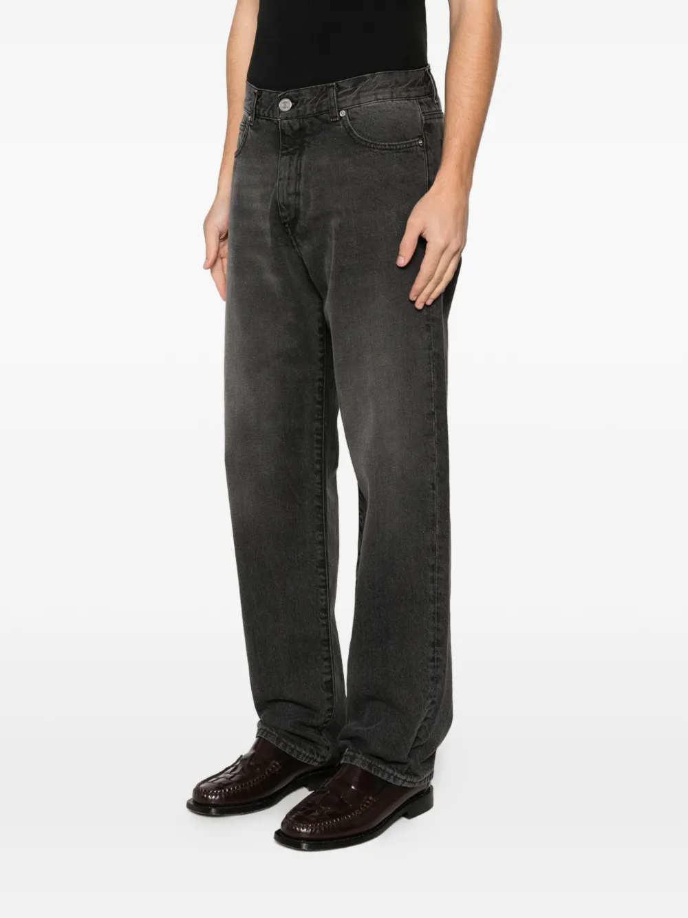 Черные джинсы с пятью карманами, прямыми штанинами, шлевками для ремня, скрытой застежкой на молнию и пуговицу