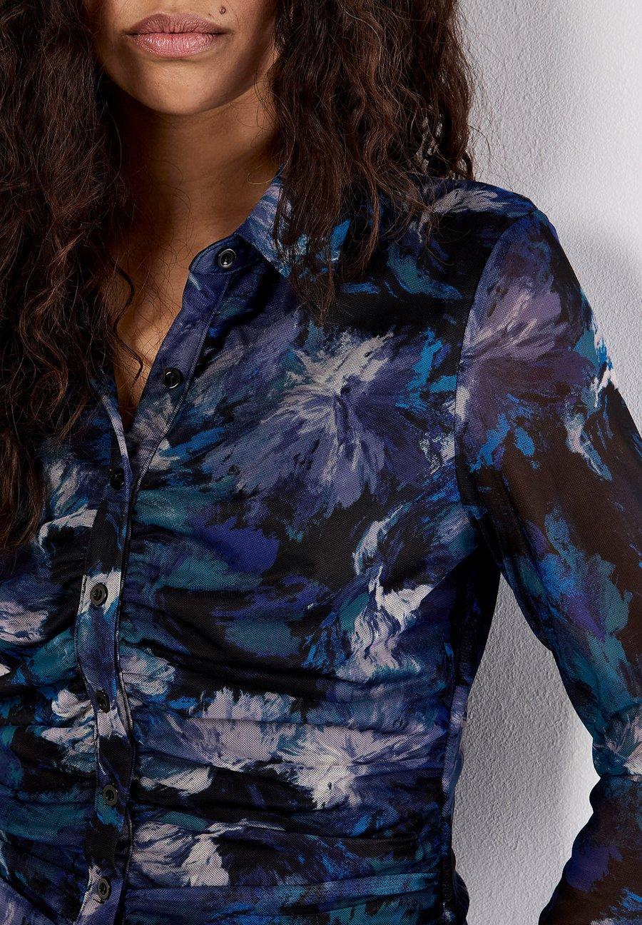 Создайте привлекательный силуэт в этом облегающем платье миди. Платье, выполненное из мягкой сетчатой ткани и имеющее подкладку для комфорта, украшено размытым цветочным принтом, застегивается на пуговицы спереди и имеет сборки по бокам. Воротник: Отложной воротникМатериал и уход