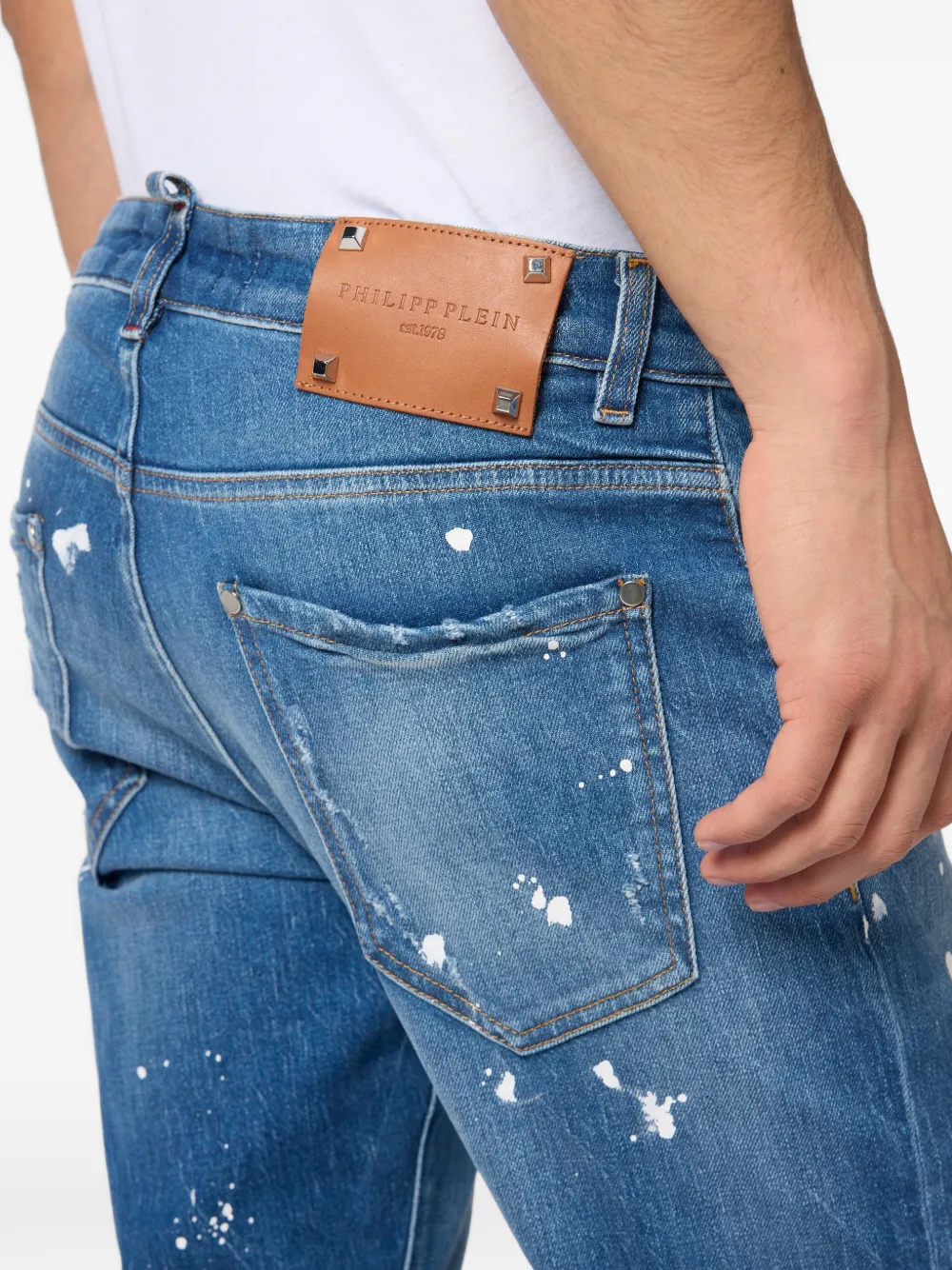 Синий с эффектом разбрызганной краски, дизайн с пятью карманами, эффект состаривания, нашивка с логотипом на спине, шлевки для ремня