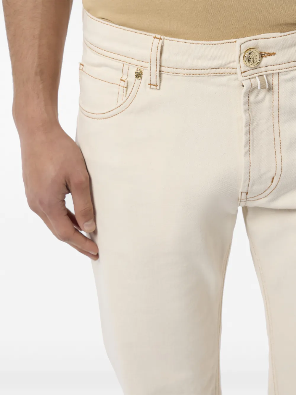 Бежевые, пять карманов, вышитые детали, однотонная строчка, застегиваются на пуговицу, шлевки для ремня