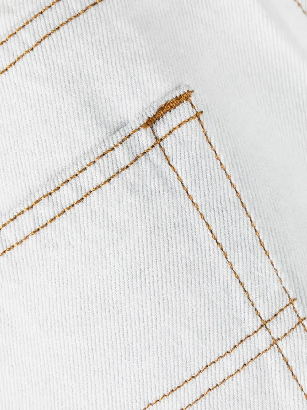 Белый, хлопок, прямой крой, застежка на пуговицы, петли для ремня и пять карманов.