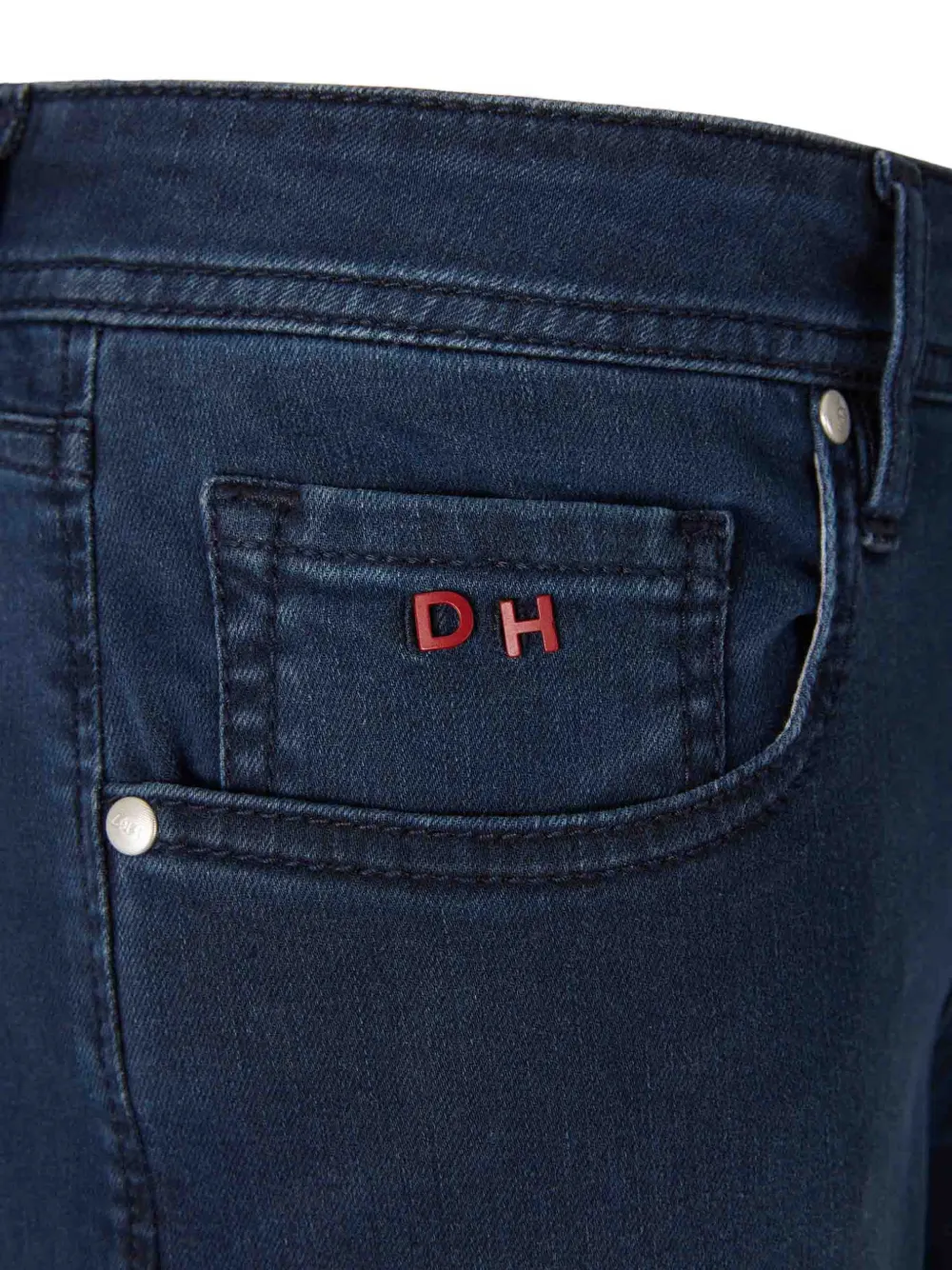 Синий цвет, видимая строчка, застежка спереди на молнию и пуговицу, боковые и задние карманы, расклешенный низ, кожаная нашивка с логотипом