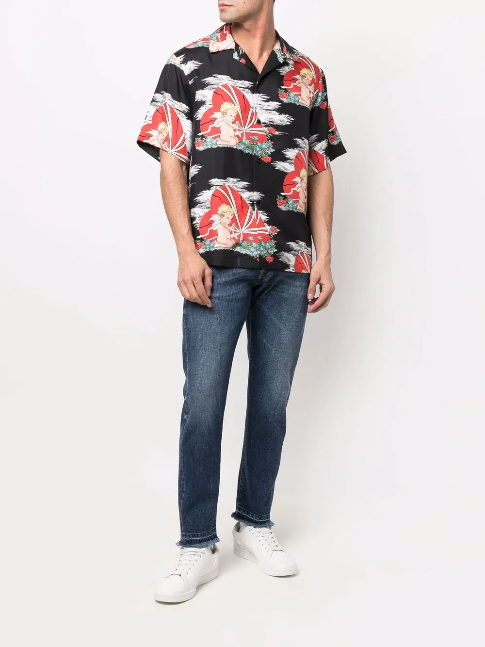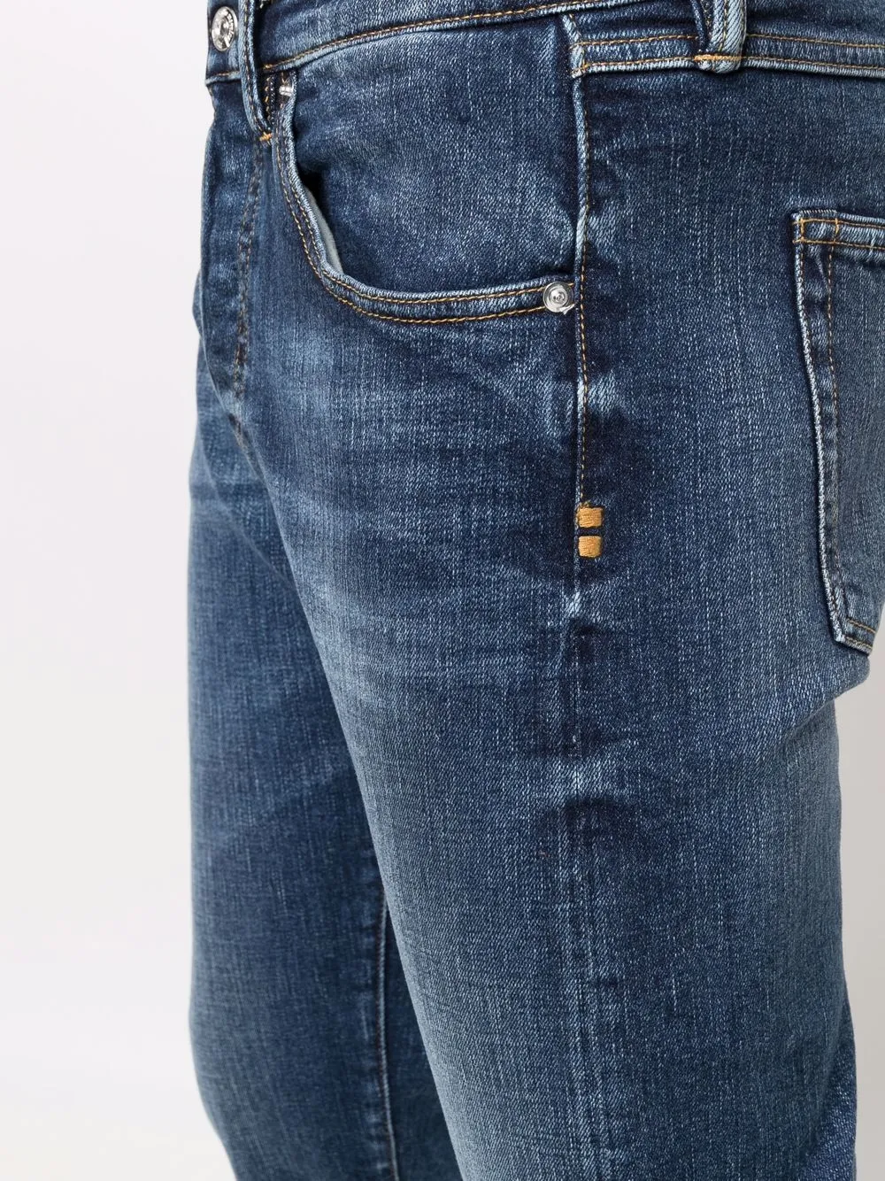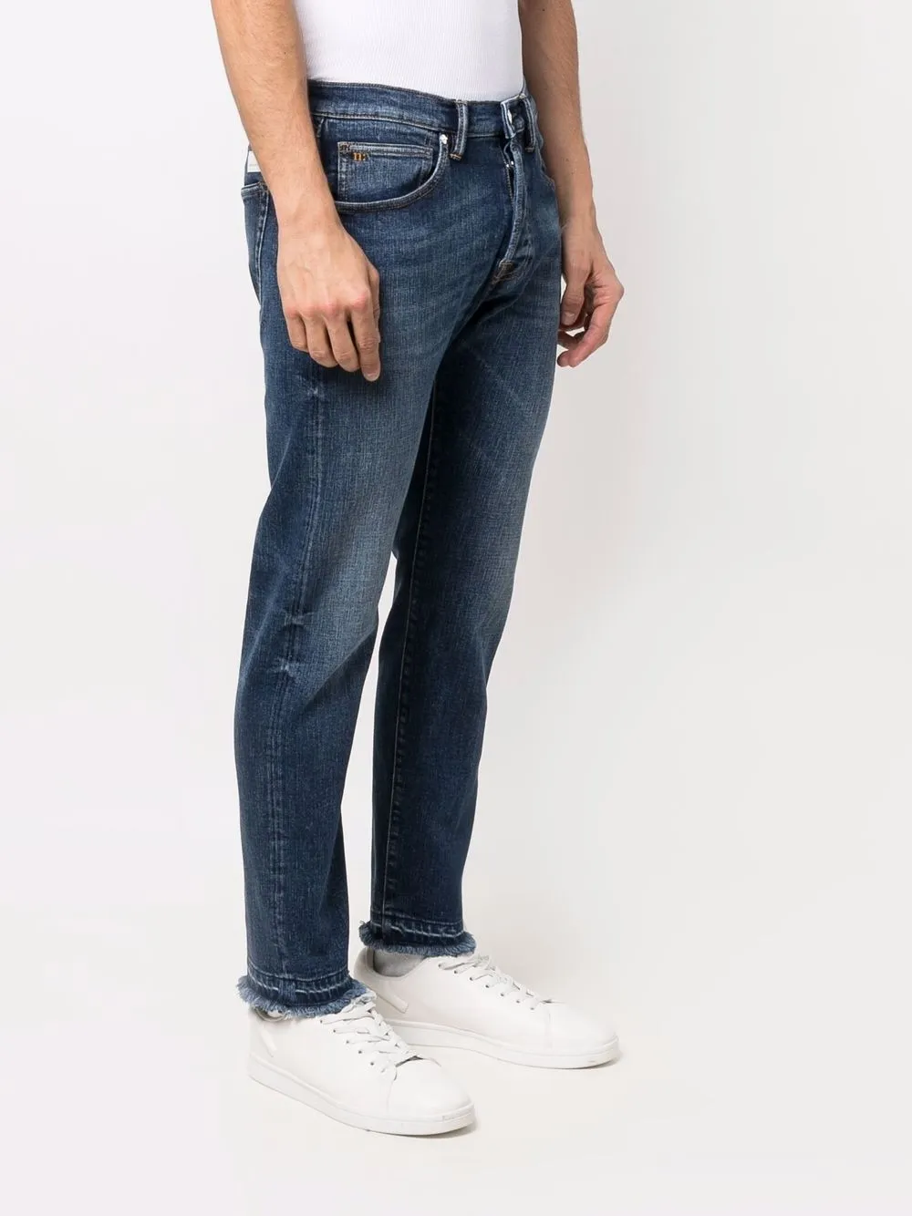 Модель из обработанного денима, нашивка с логотипом сзади, узкий крой, средняя посадка, декоративные складки на бедрах, необработанные края, классическая пятикарманная модель, потайная застежка на молнии и пуговицах и петли для ремня.