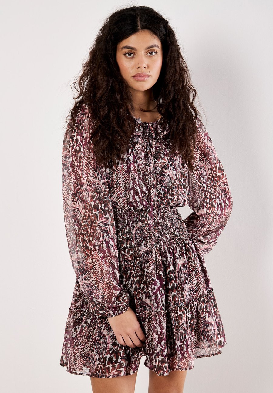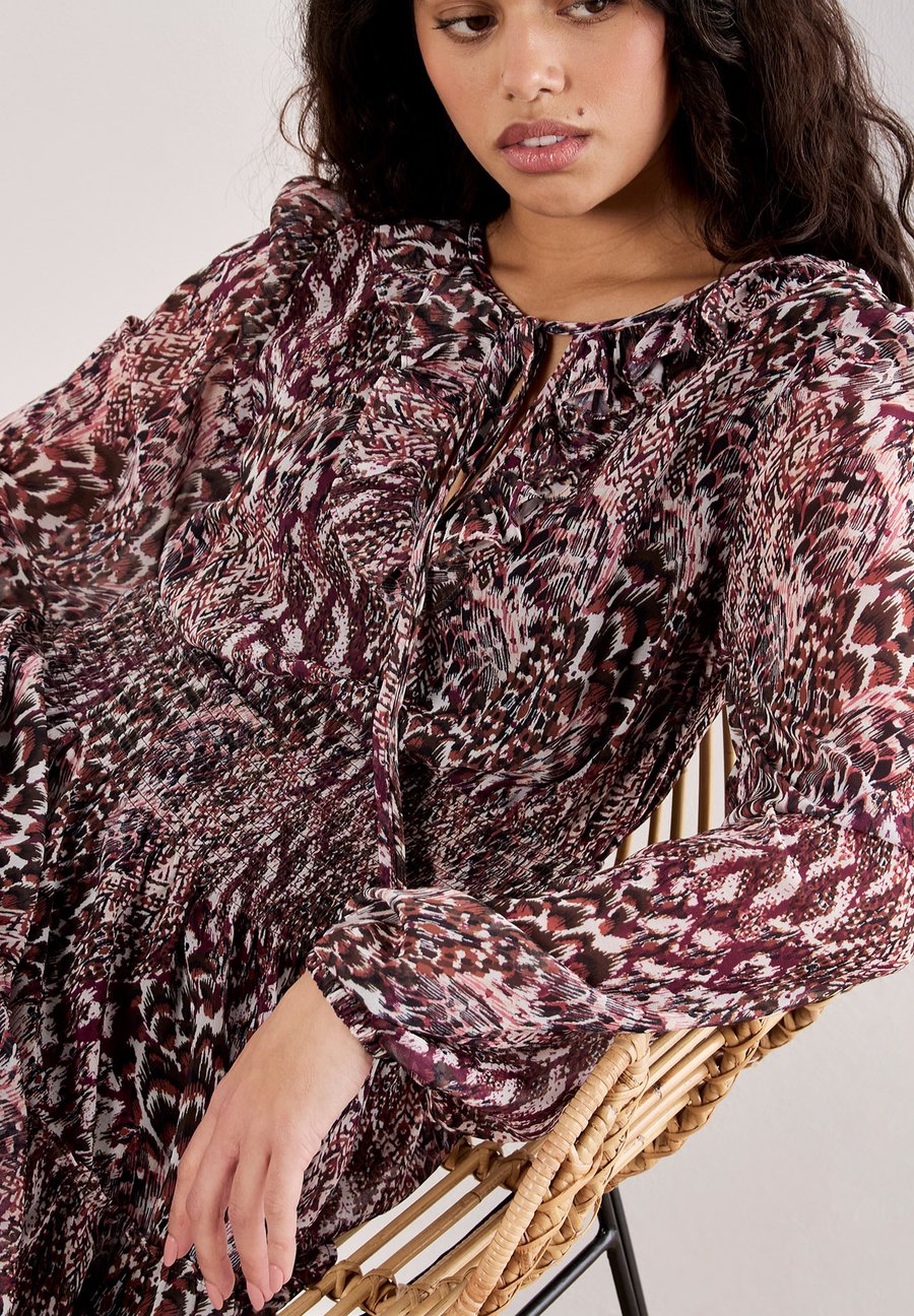 Прикоснитесь к стилю бохо с этим мини-платьем с принтом в виде перьев. Платье, сшитое из легкого шифона и имеющее подкладку для комфорта, отличается присборенной талией для привлекательной посадки, рукавами-фонариками и воротником с оборками и завязками. Вырез: КруглыйМатериал и уход