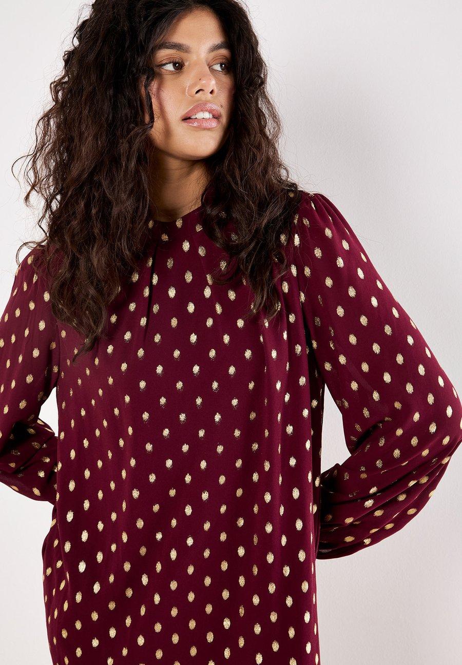 Это элегантное мини-платье сочетает в себе шикарный силуэт прямого кроя и принт в горошек из золотистой фольги. Изготовленное из легкого шифона и имеющее подкладку для комфорта, это платье с рукавами-фонариками и вырезом на спине с застежкой-капелькой на затылке. Вырез: КруглыйМатериал и уход
