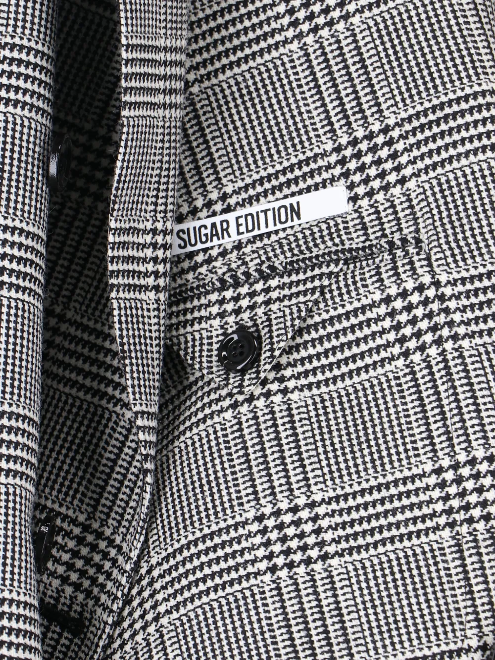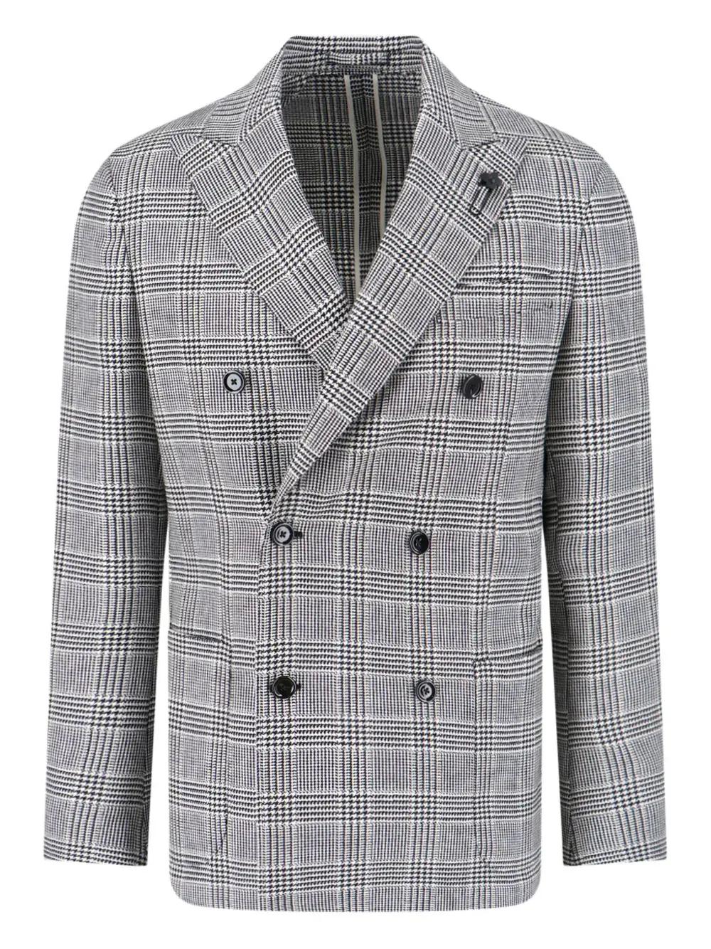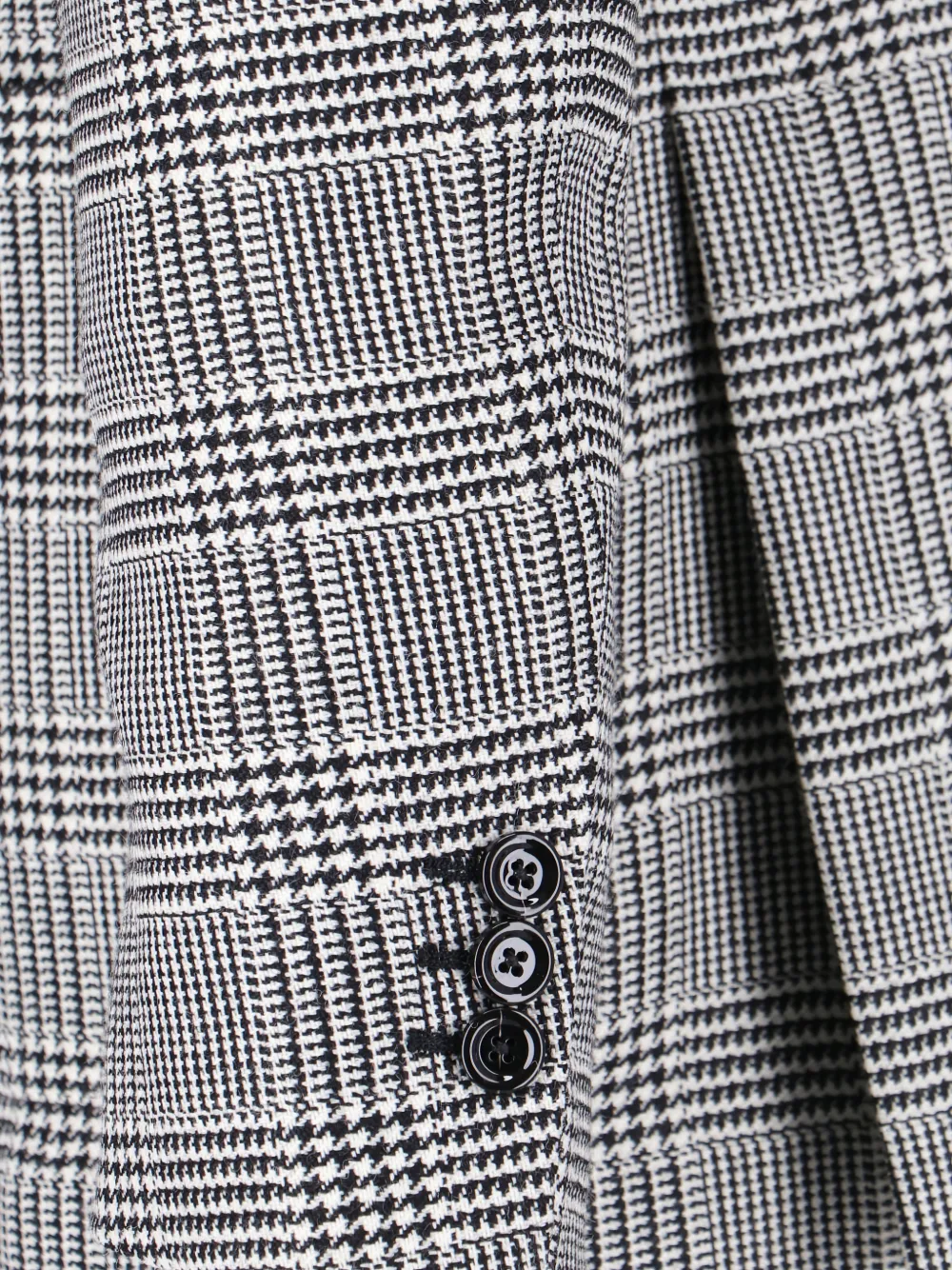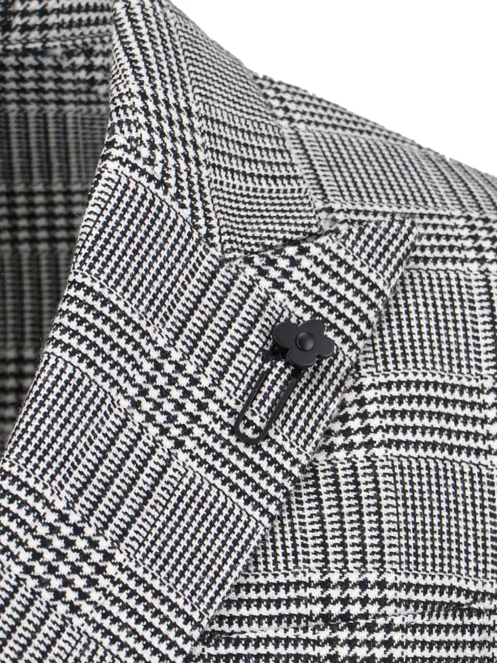 Белый пиджак в клетку с двубортной застежкой, булавкой в виде цветка на лацкане и застежкой на пуговицы
