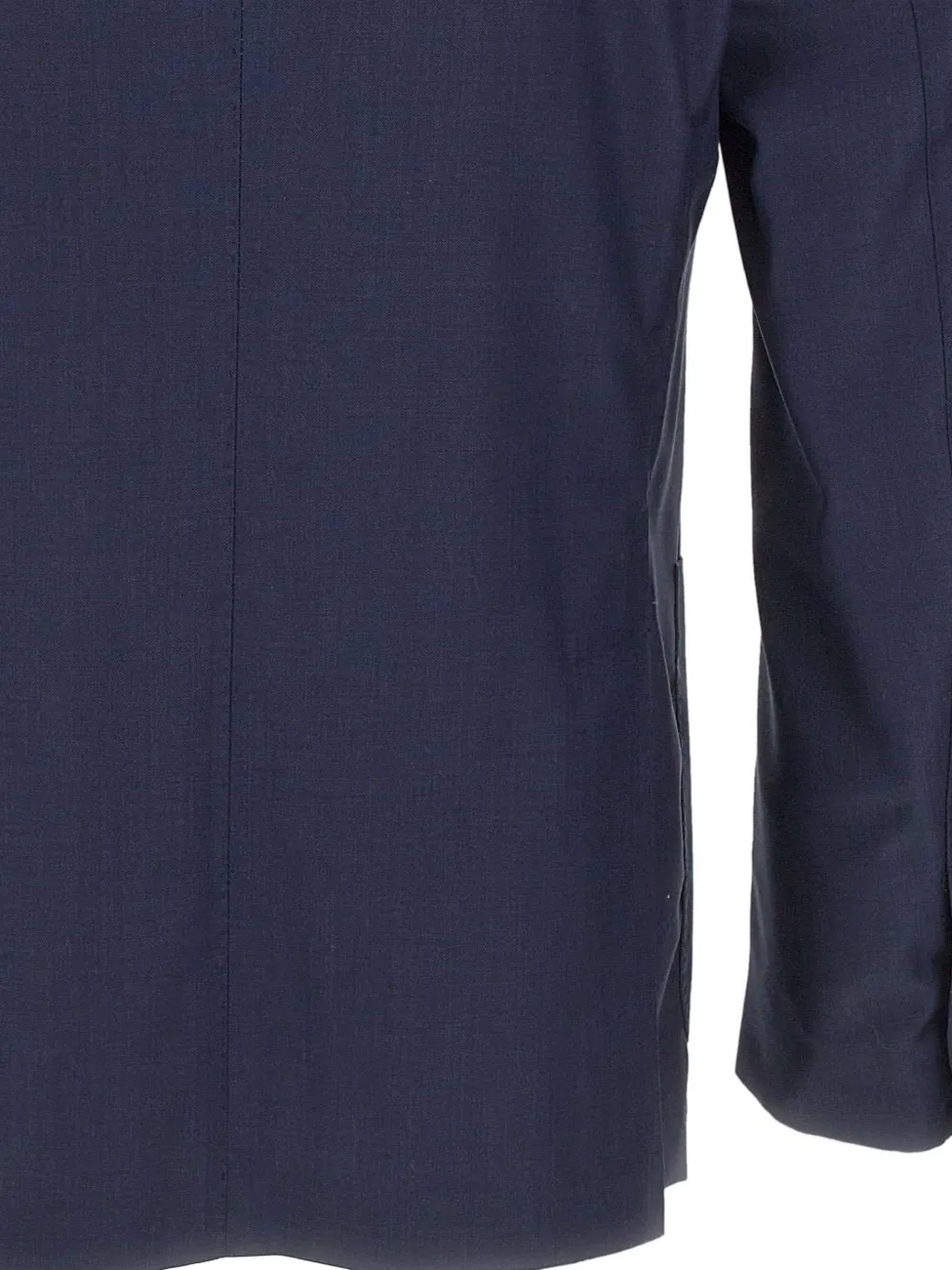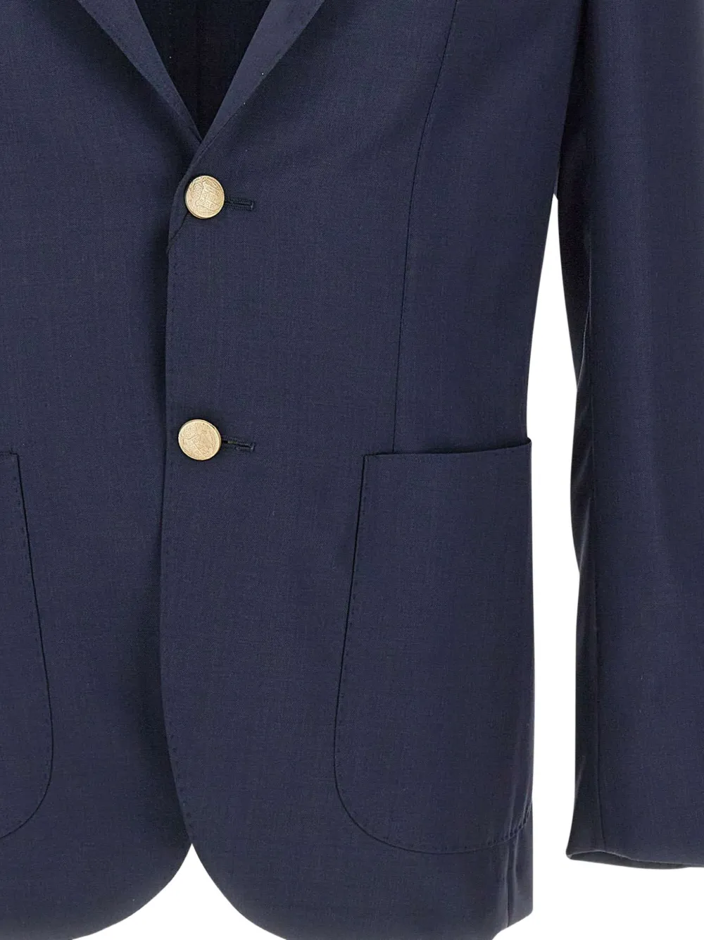 Синие лацканы с выемкой, застежка на пуговицы спереди, накладные карманы, манжеты на пуговицах, английские шлицы сзади