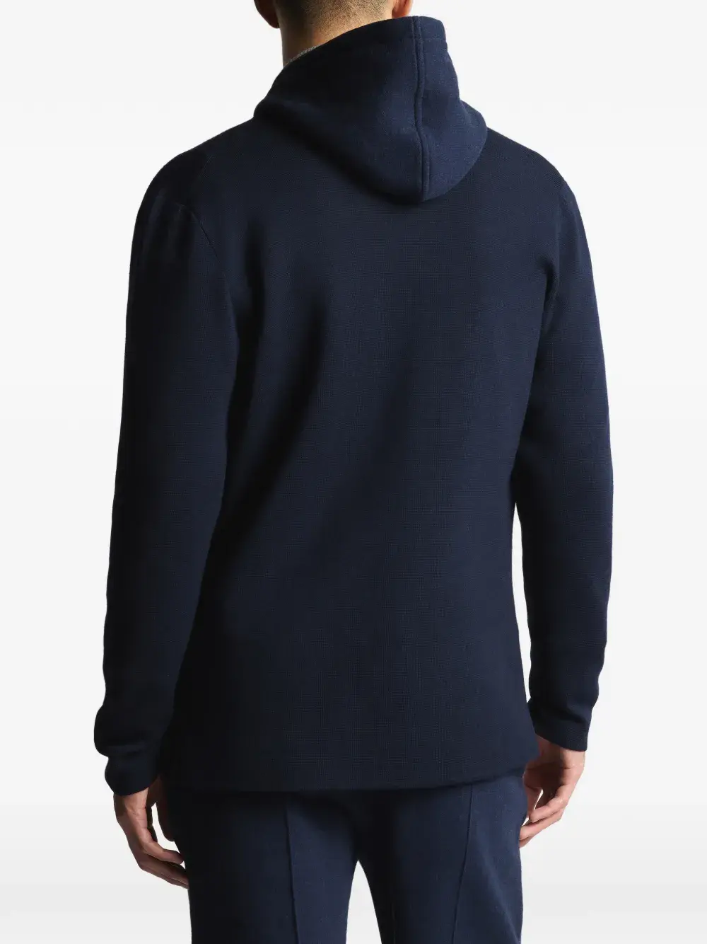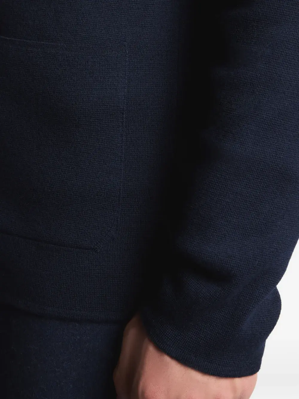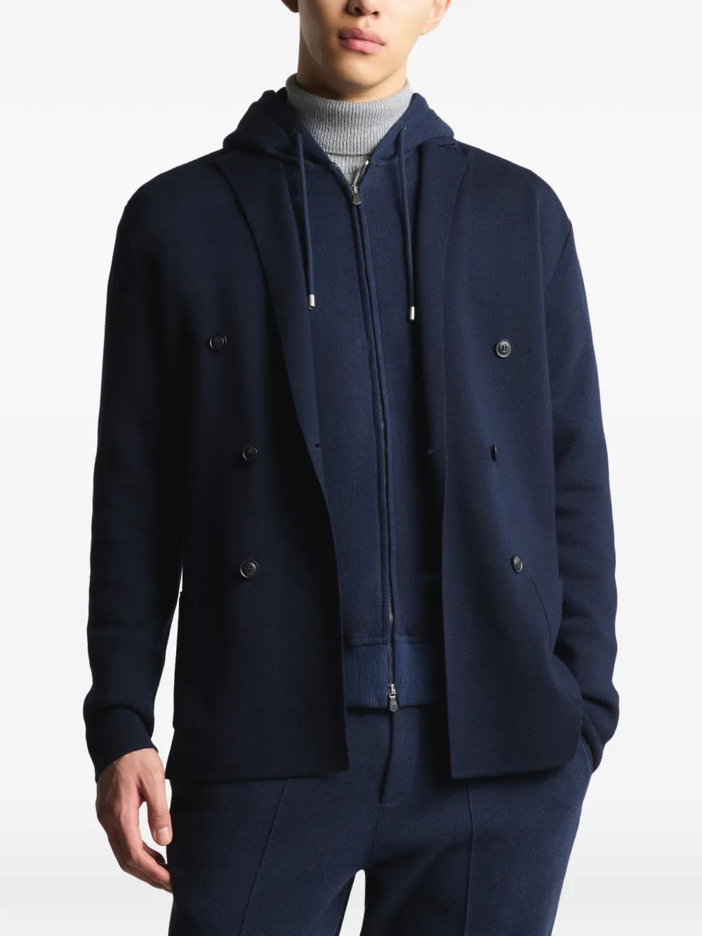 Темно-синий двубортный плащ с пристегивающимся капюшоном, застежкой на пуговицы и накладными карманами