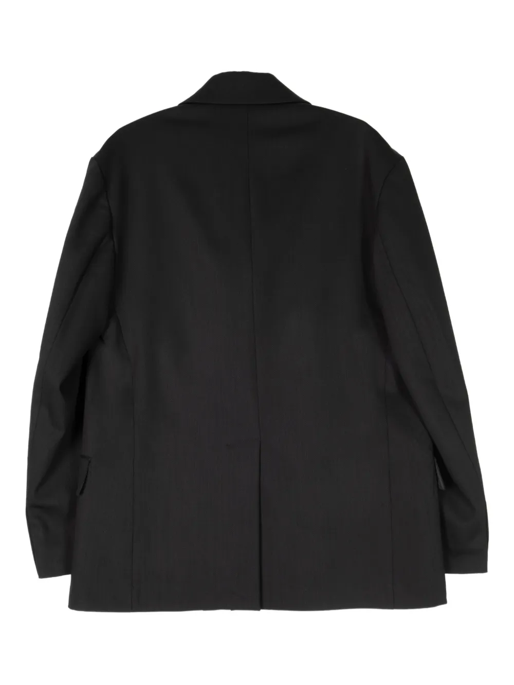 Чёрный двубортный пиджак с лацканами, клапанными карманами и застёжкой на пуговицы