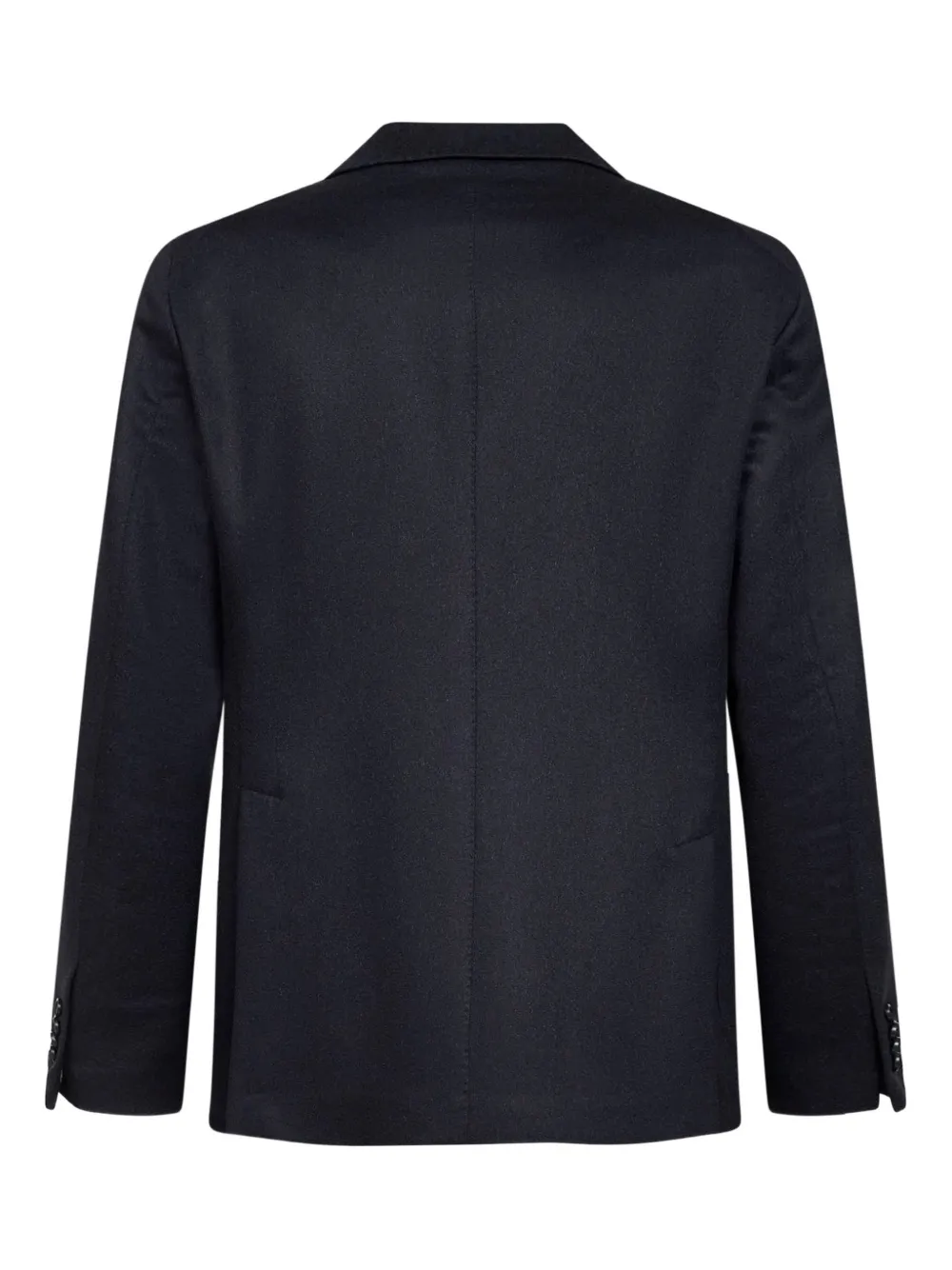 Синий пиджак на две пуговицы, лацканы с вырезом, значок с логотипом на лацкане, накладные карманы спереди, манжеты на четыре пуговицы