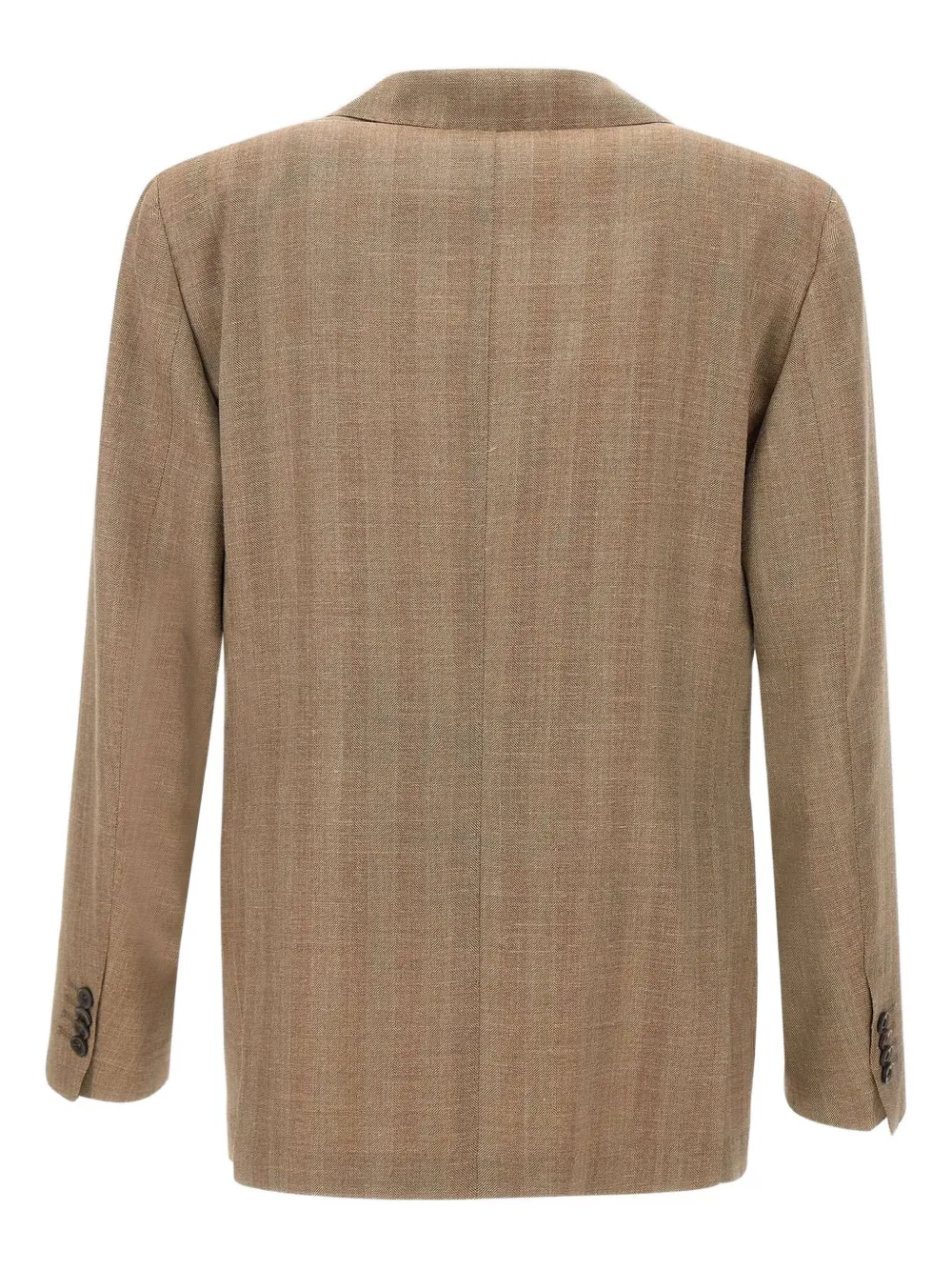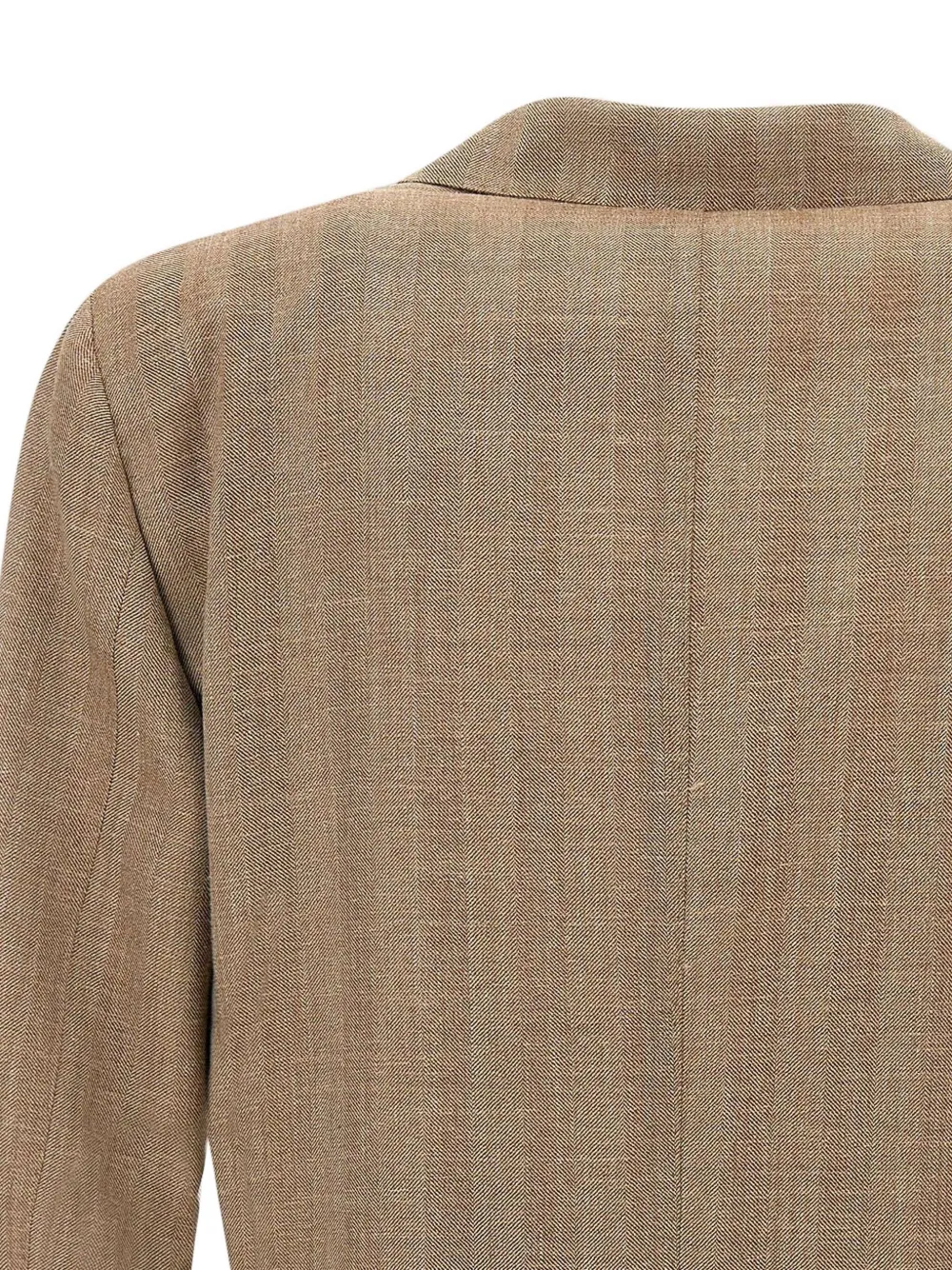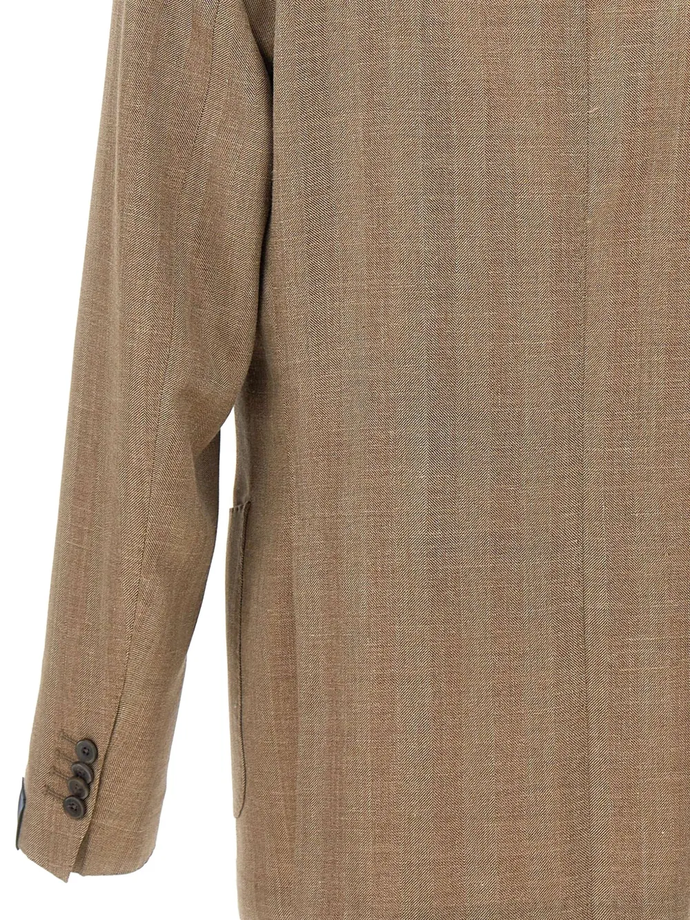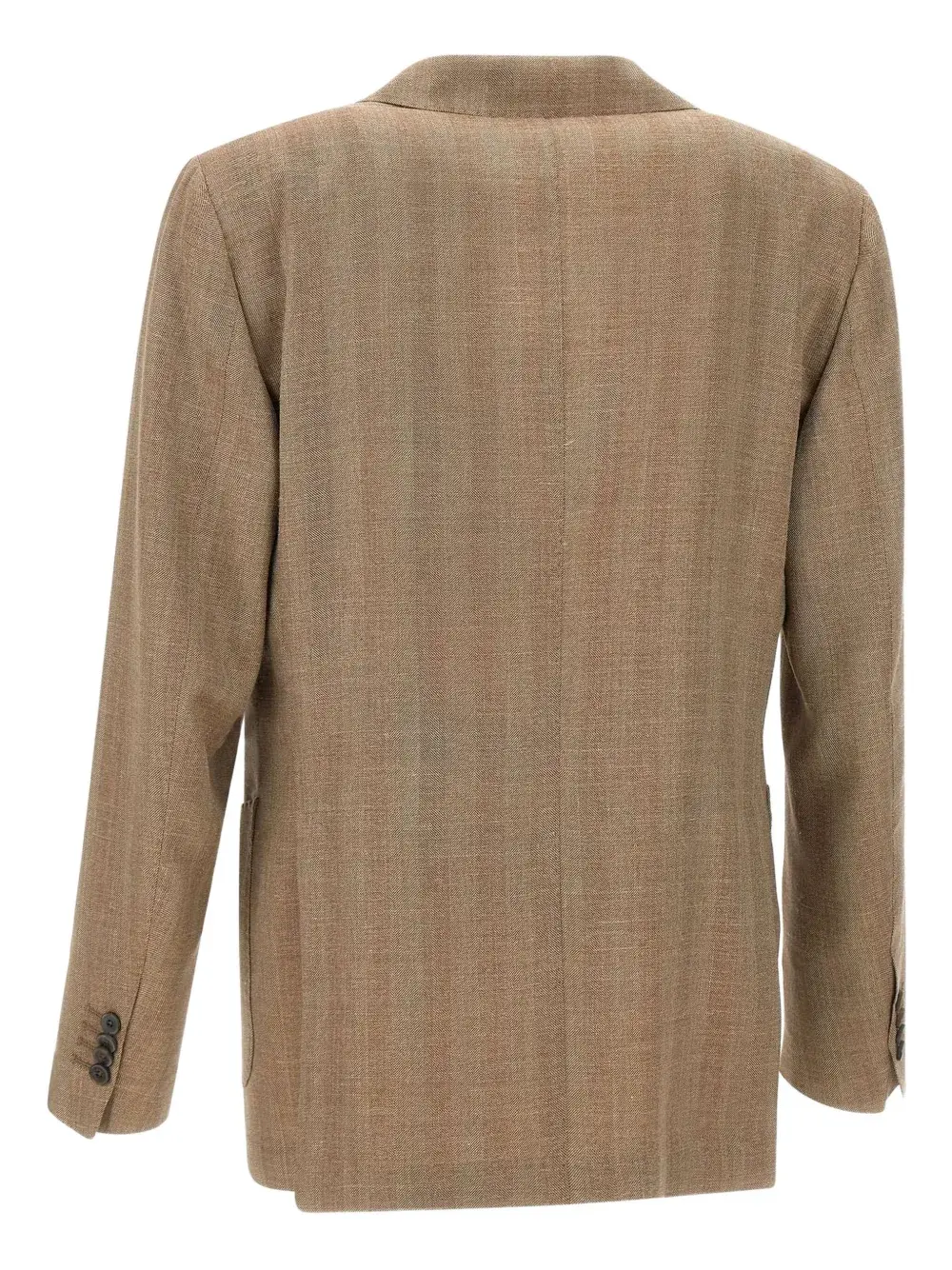 Мужской пиджак Santaniello из смеси шерсти, шелка и льна, табачного цвета, изысканная ткань и очень комфортный на ощупь и в носке, воротник с лацканами-«копье», застежка на две пуговицы с пуговицами в тон, накладные карманы спереди, внутренние карманы, нагрудный карман, разрезы сзади, фирменная отделка Mf, приталенный крой. 65% шерсть, 21% шелк, 14% лен.