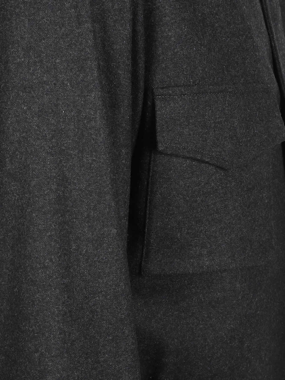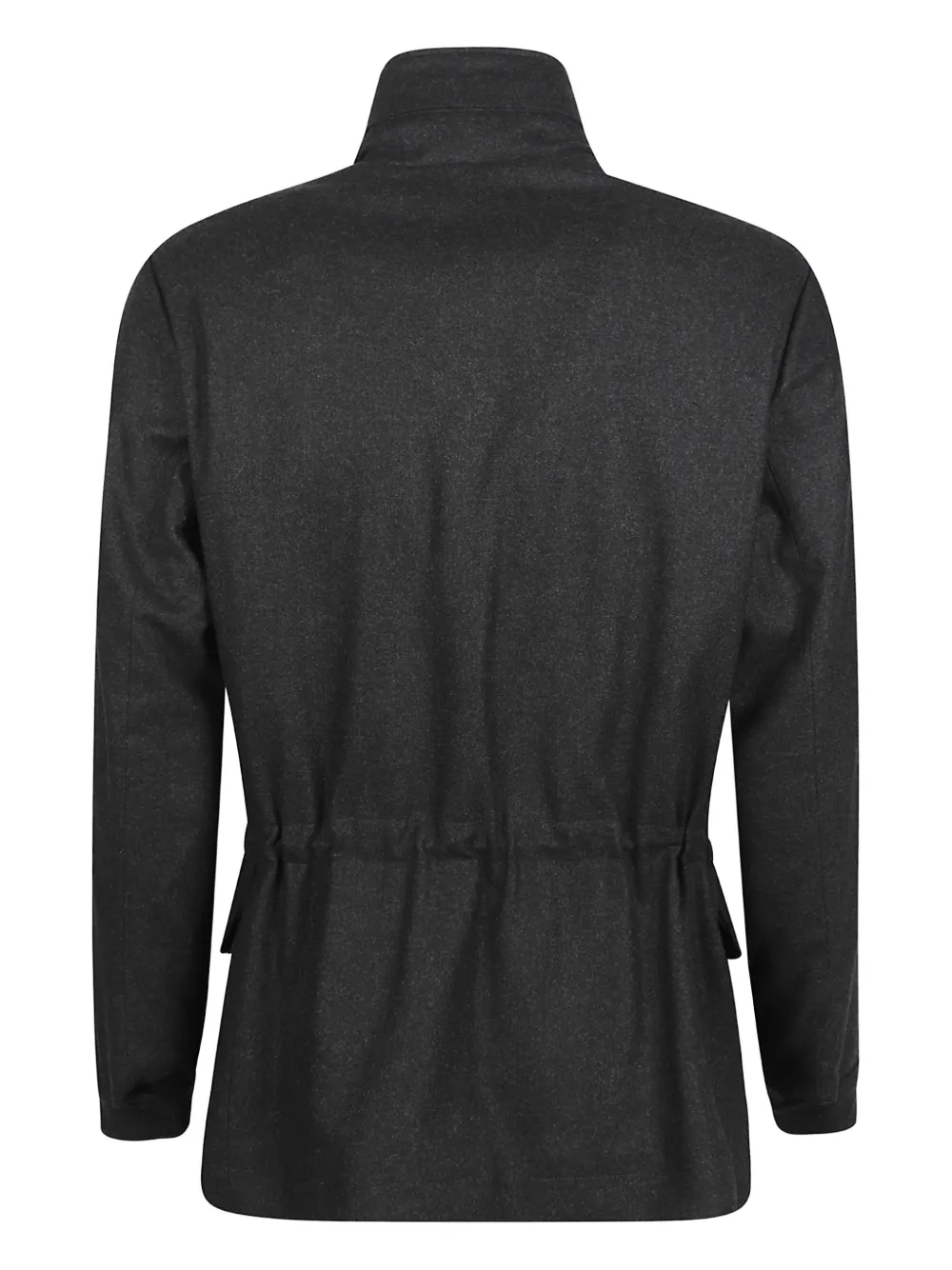 Серый цвет, клапаны на карманах, шнурок, длинные рукава, высокий воротник, застежка на пуговицах спереди
