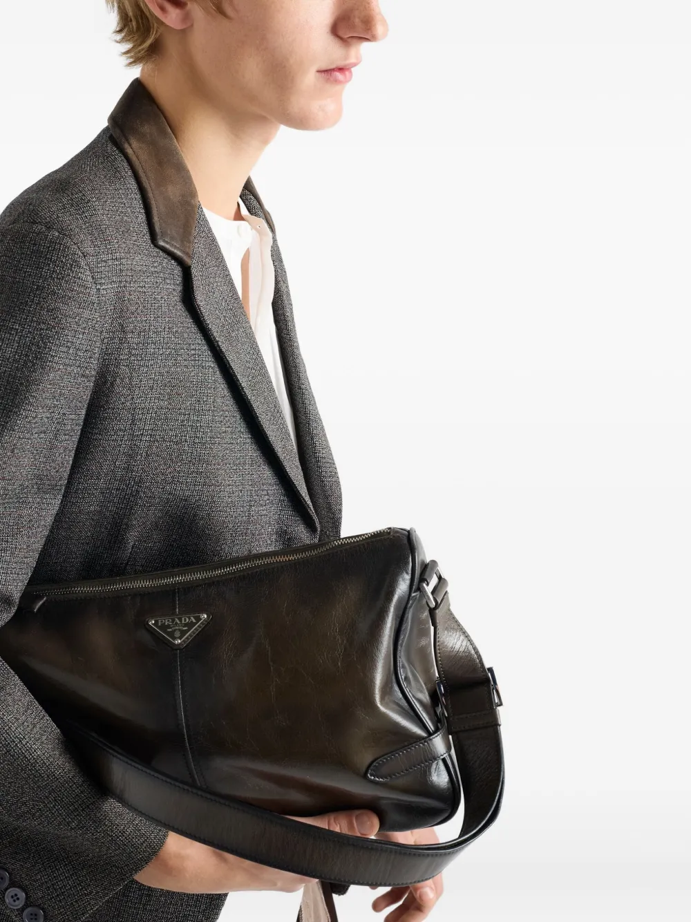 Однобортный пиджак с кожаным воротником Prada, серый 405 395₽