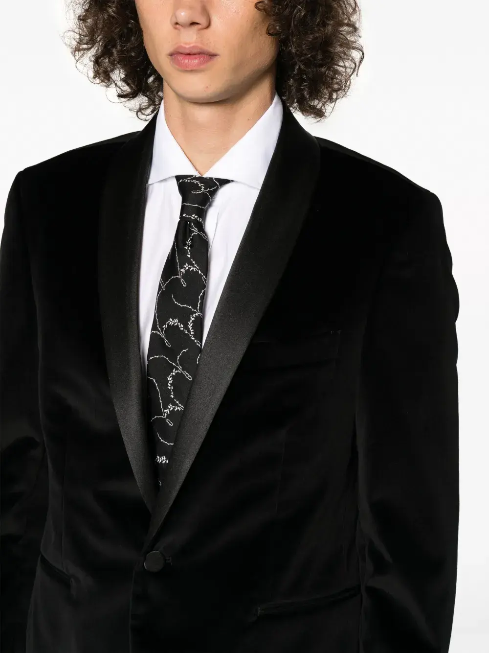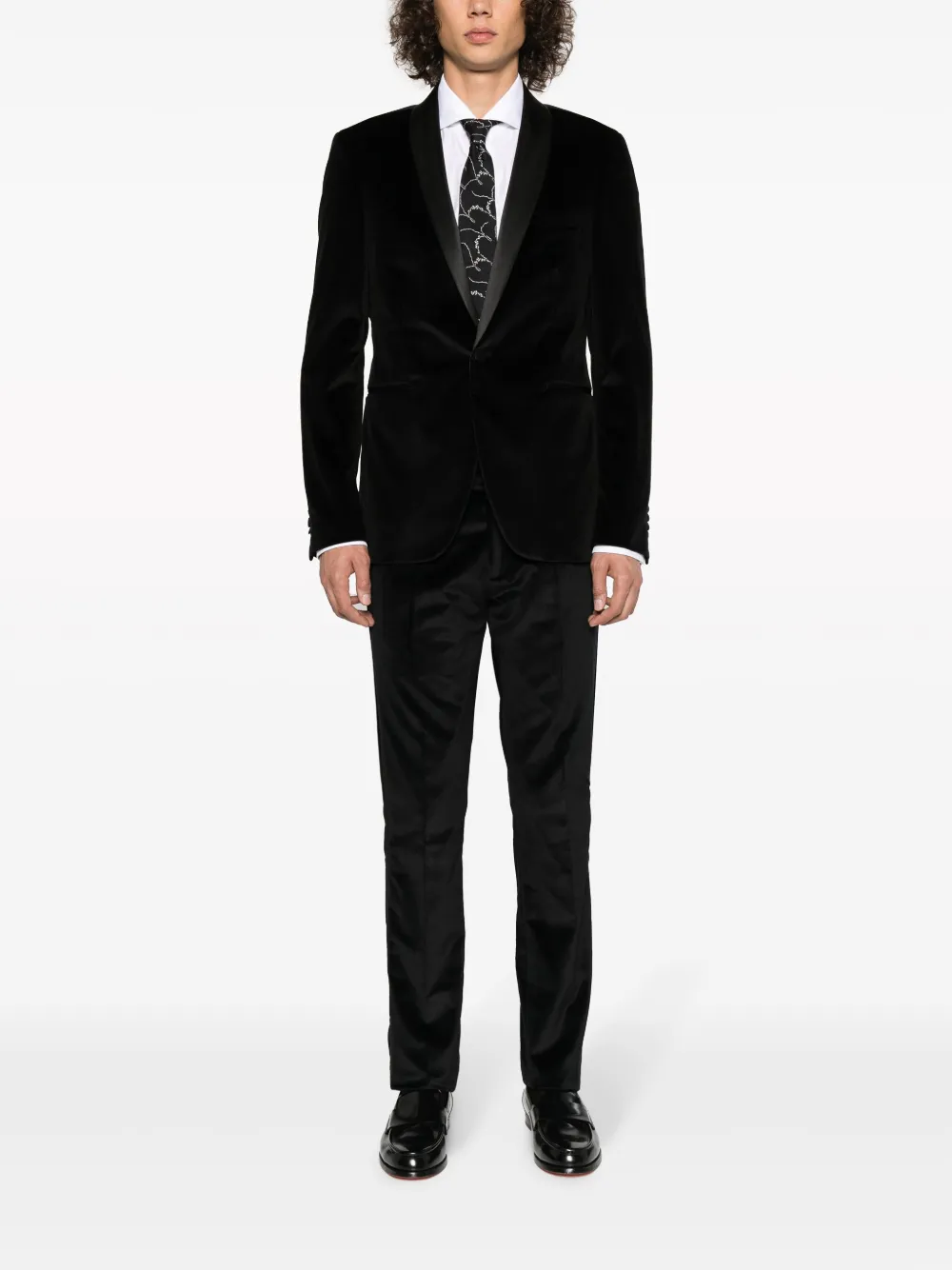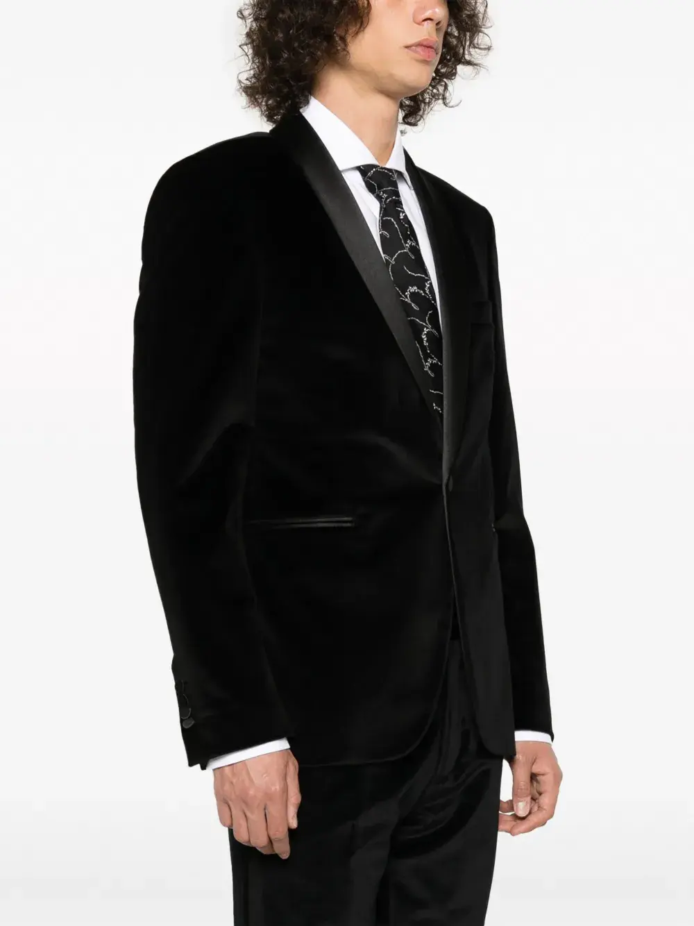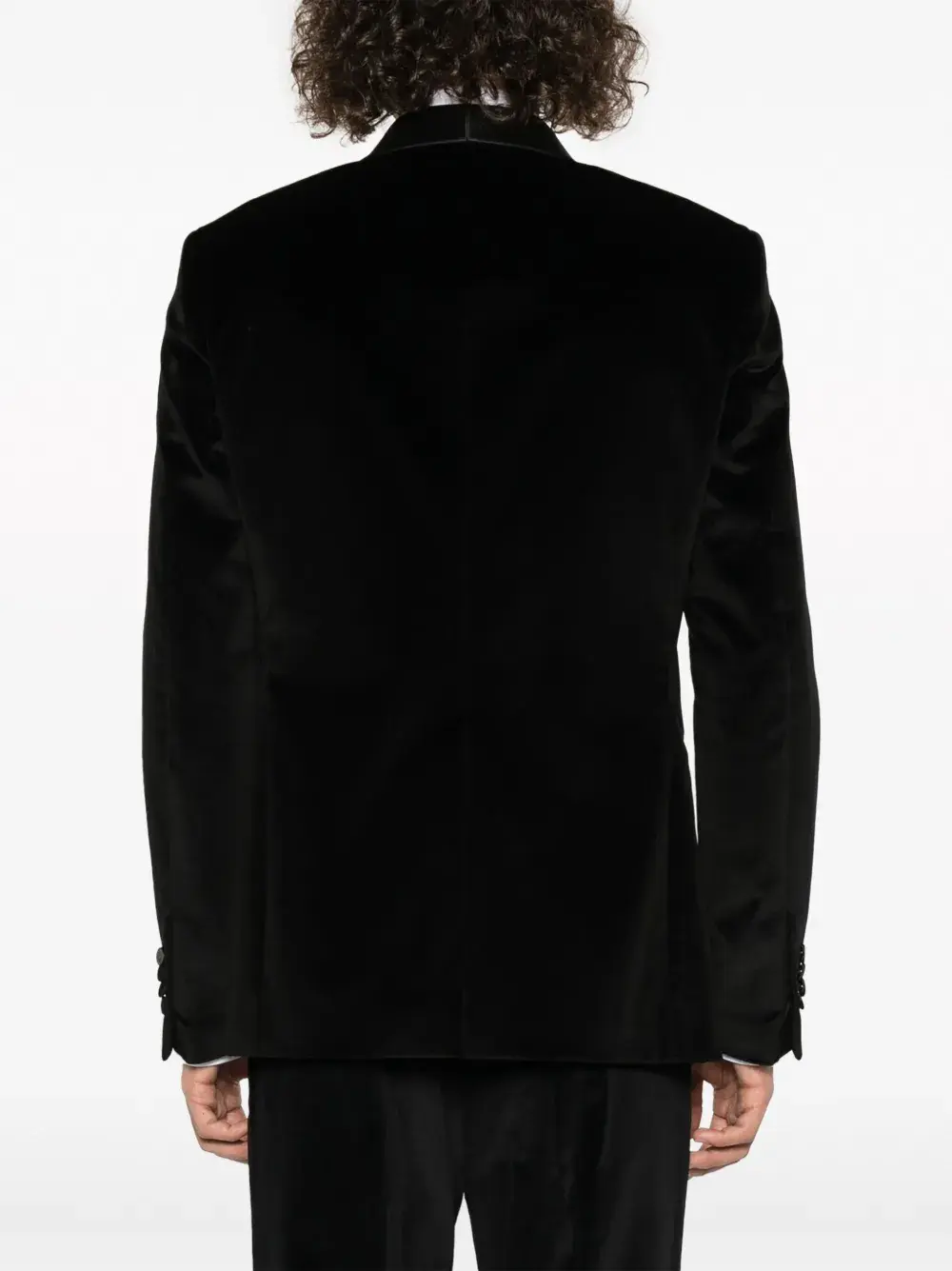 Черный, эластичный хлопок, бархатистое покрытие, лацканы-шалька, застежка на пуговицах спереди, длинные рукава, манжеты на пуговицах, два передних кармана с листочкой и шлица по центру сзади.