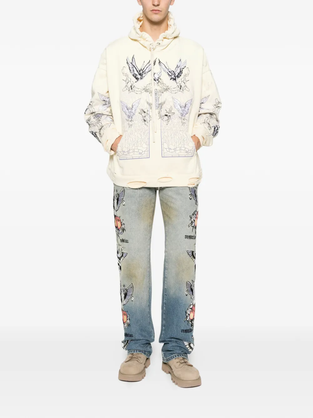 Жёлтая куртка с вышивкой в виде птицы, эффектом состаривания, капюшоном, длинными рукавами и ребристыми краями