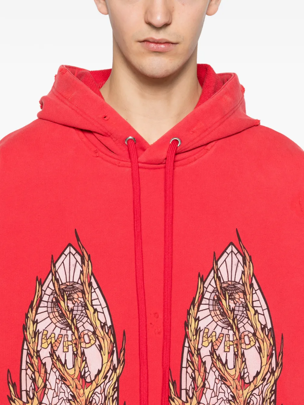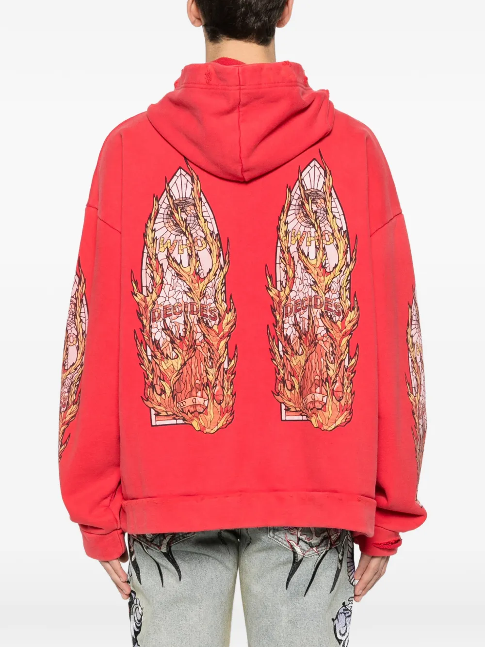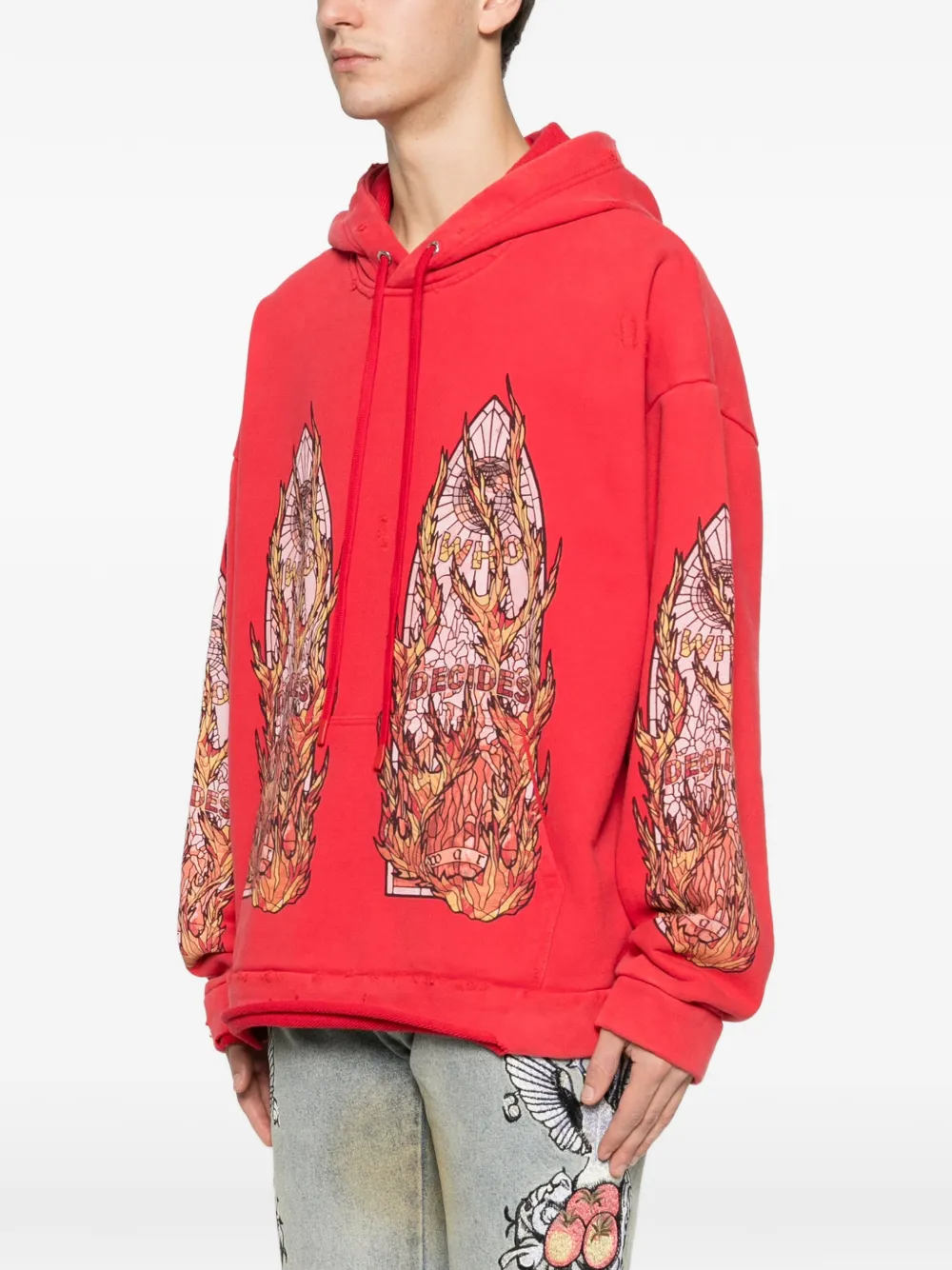 Красное худи с графическим принтом, капюшоном на кулиске, длинными рукавами и ребристыми манжетами