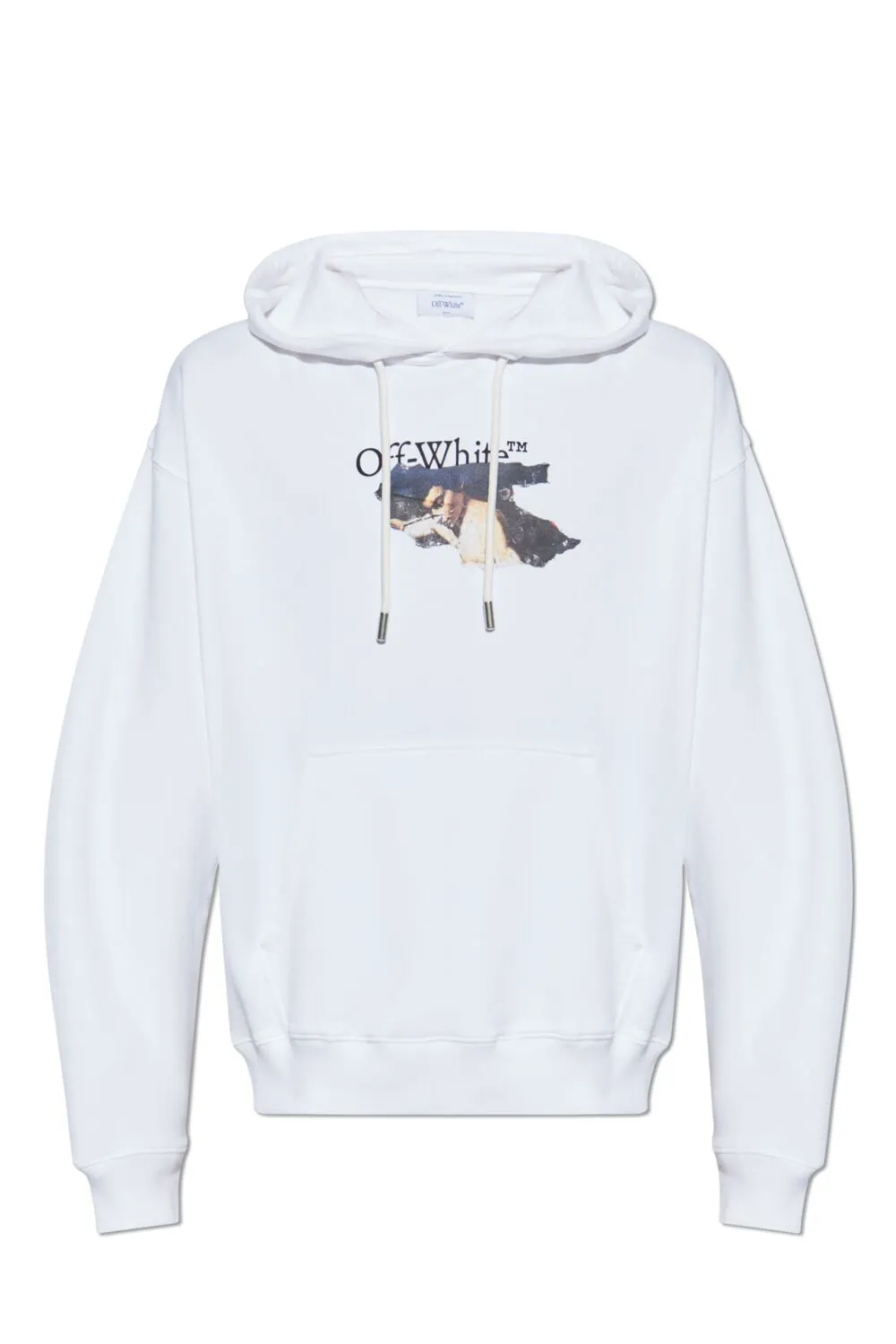 Белое худи с графическим принтом, карманом-кенгуру, завязками на капюшоне, длинными рукавами и ребристыми манжетами