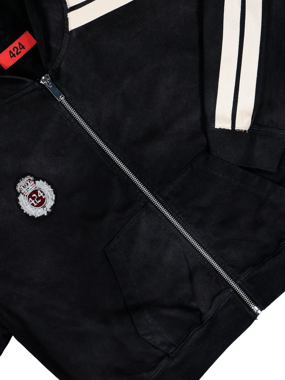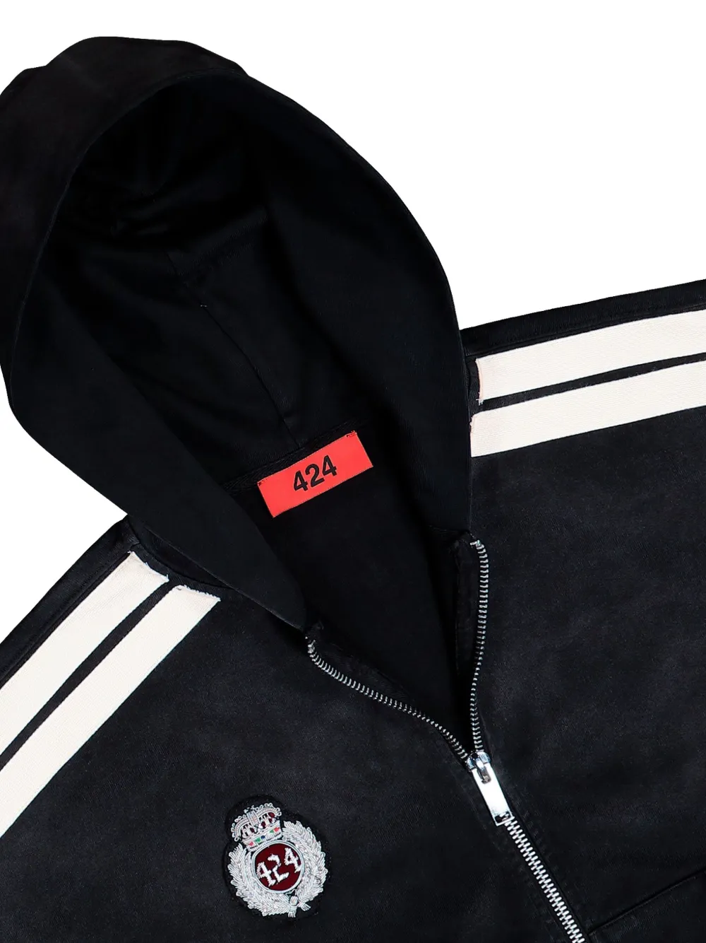 Черные полосатые детали, нашивка с логотипом, застежка-молния, капюшон, карманы