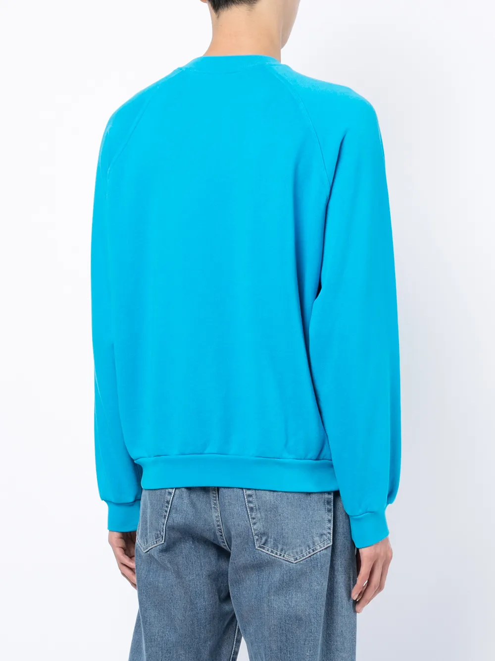Логотип спереди, круглый вырез и длинные рукава реглан.