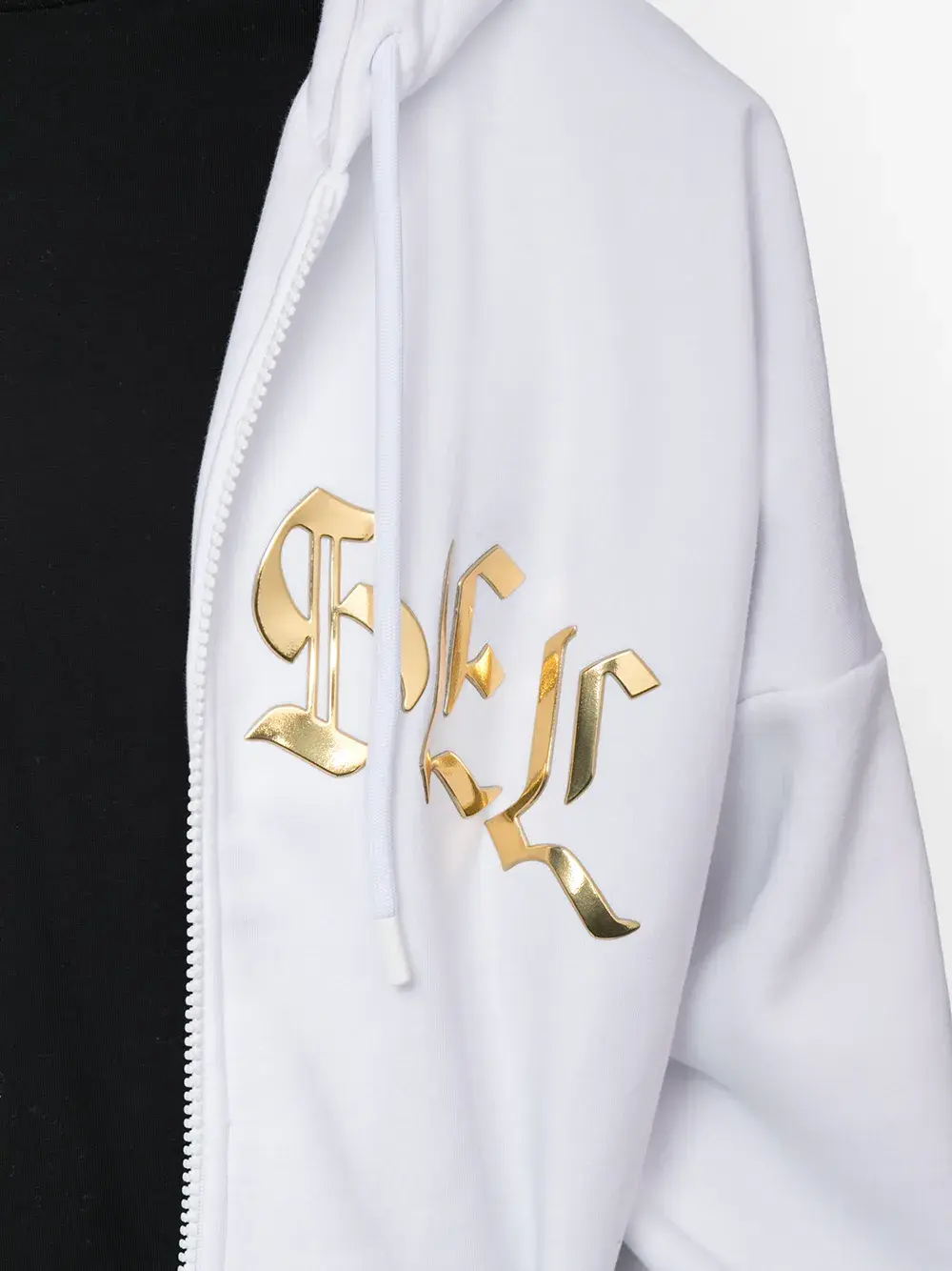 Объемный капюшон на шнурке, застежка на молнии спереди, золотистый логотип, длинные рукава, два накладных кармана по бокам и края в рубчик.