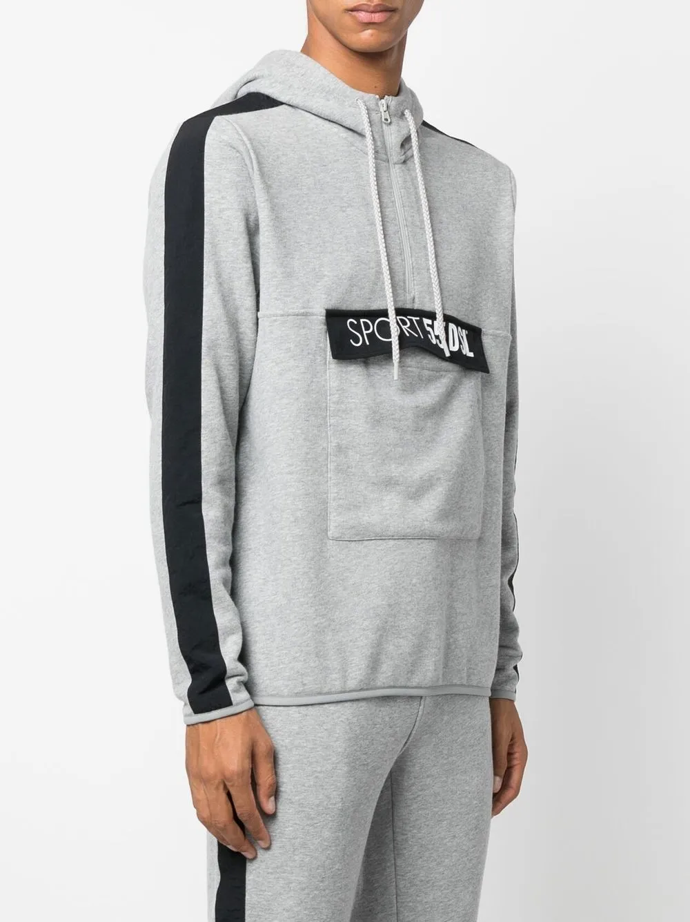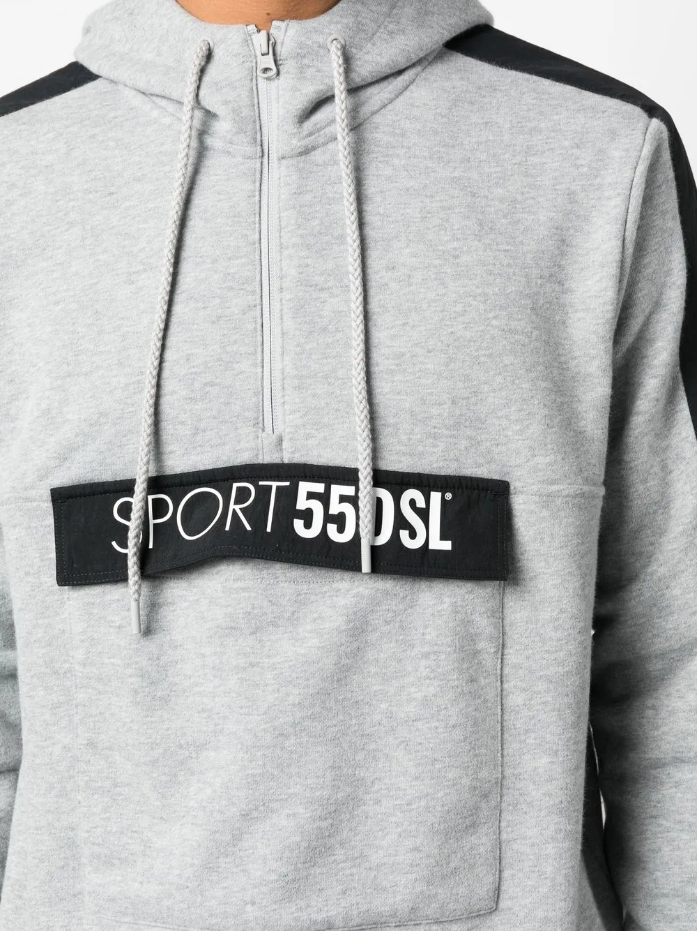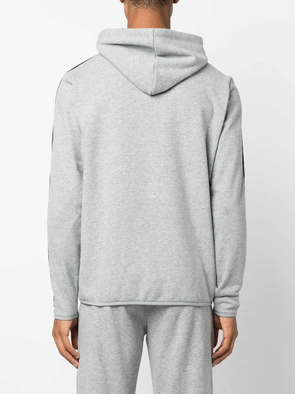 Серый, черный, хлопок, флисовый материал, логотип спереди, полоска сбоку, затягивающийся на шнурок капюшон, передний карман с клапаном, длинные рукава и прямой подол.
