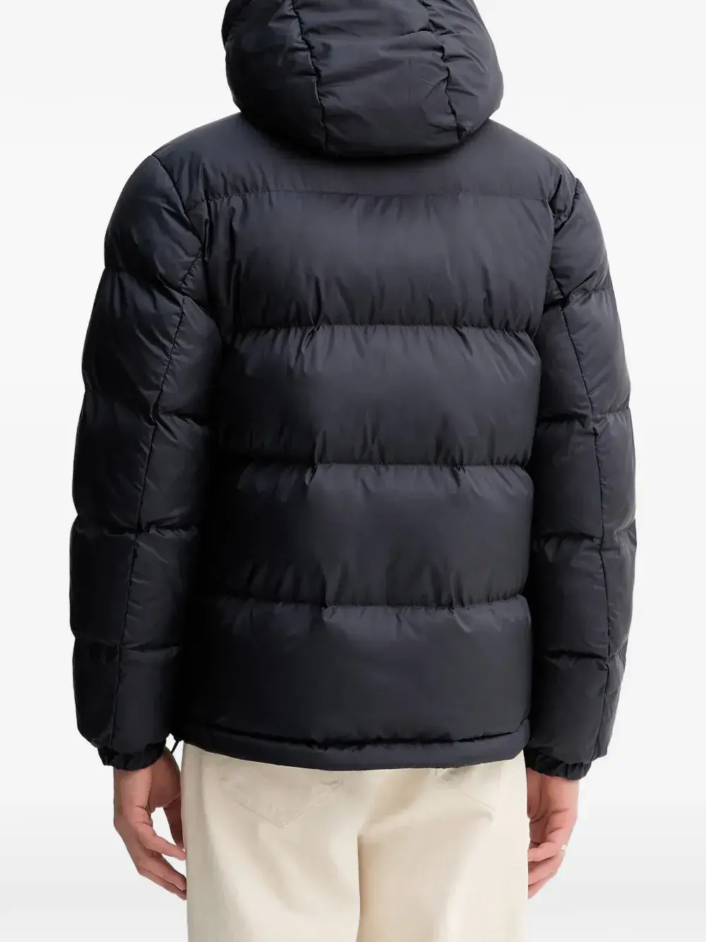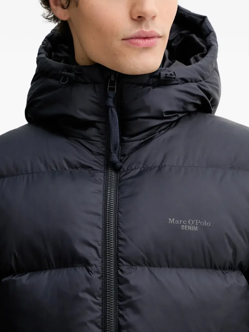 Тёмно-синий пуховик с капюшоном, застёжкой-молнией, логотипом, передними карманами и простёжкой