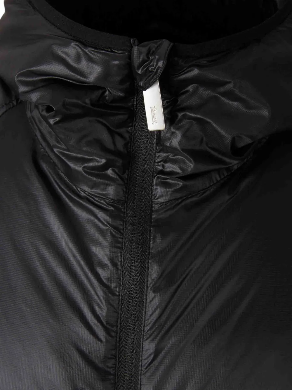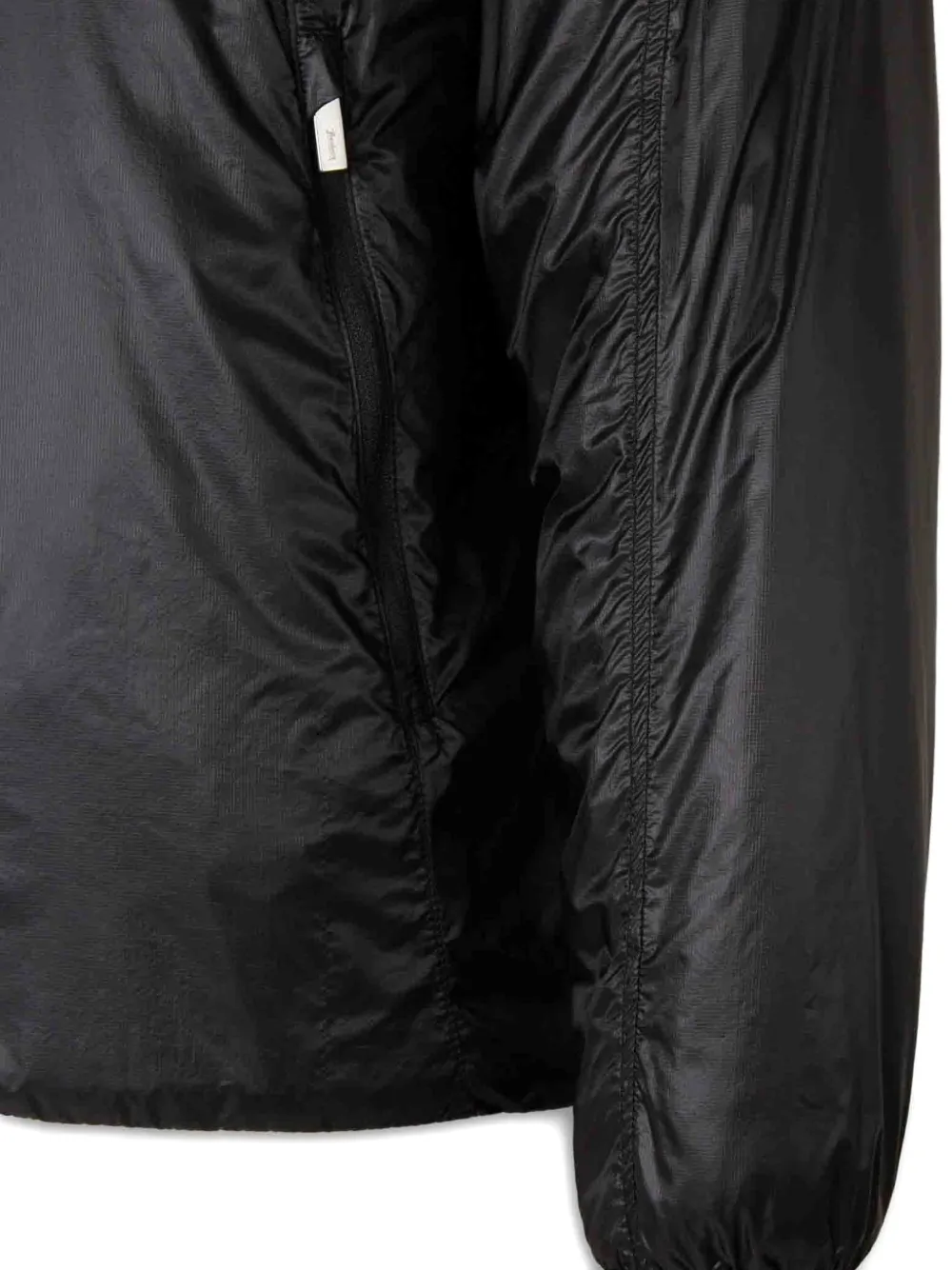 Чёрная куртка с капюшоном, застёжкой-молнией, заметными швами, боковыми карманами на молнии и эластичным низом