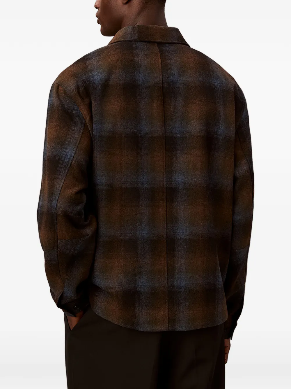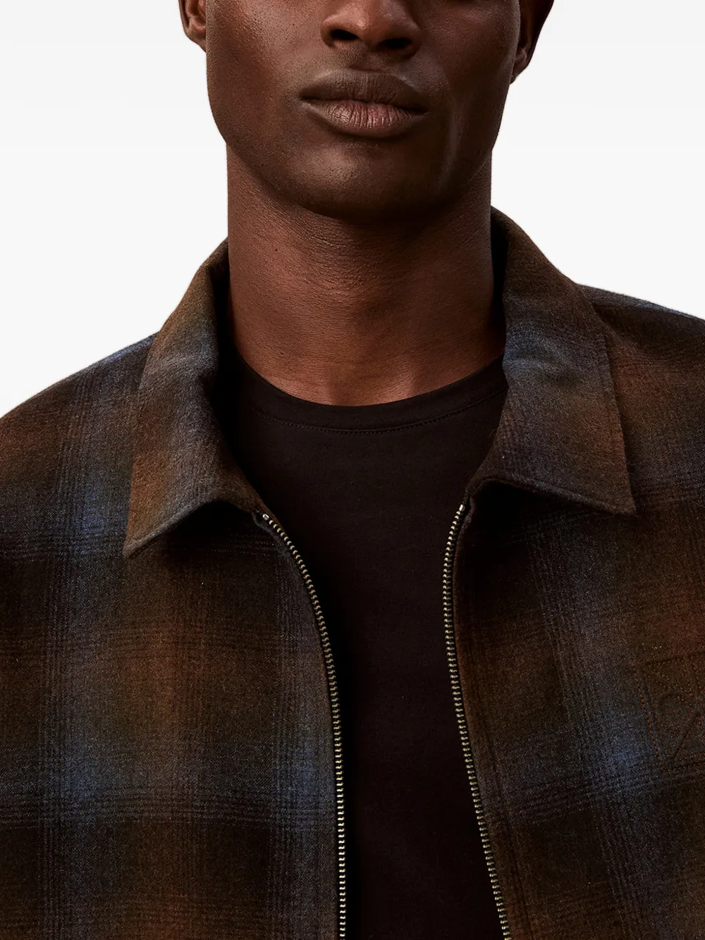 Коричнево-синяя рубашка в клетку, застежка-молния, классический воротник, длинные рукава, логотип на груди