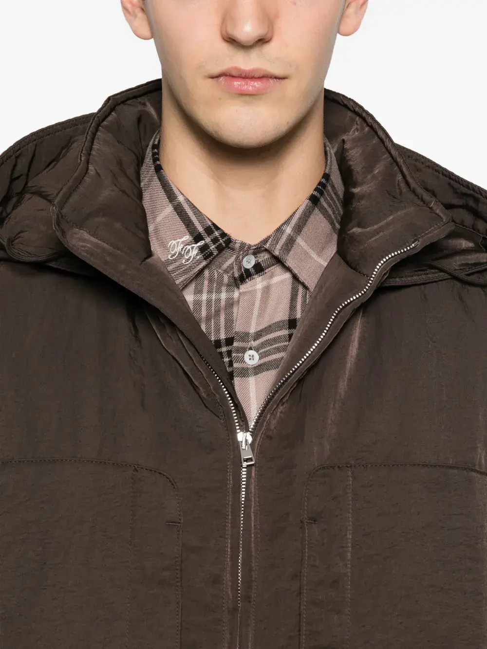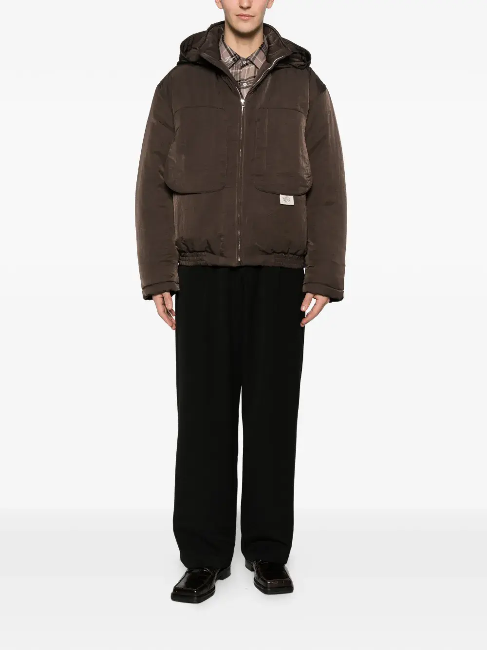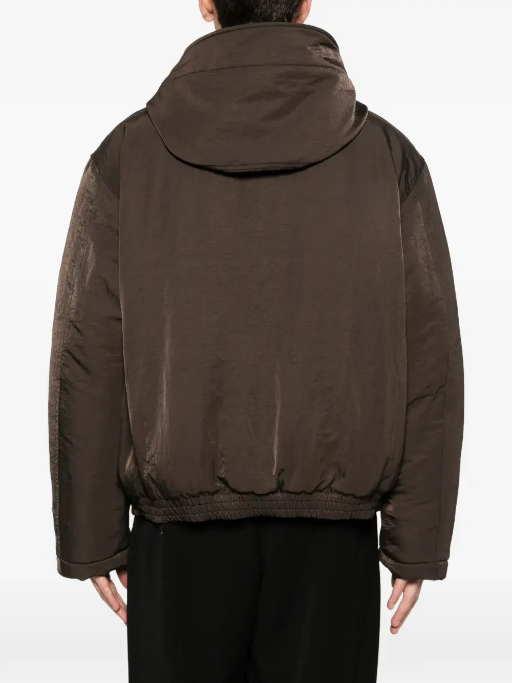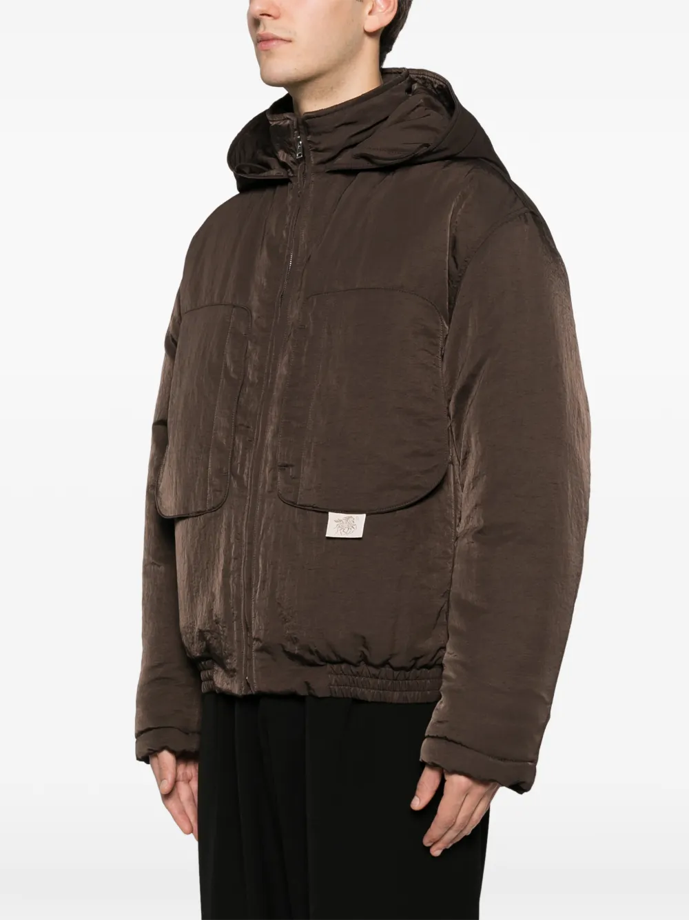 Коричневая куртка с капюшоном, застежкой на молнии, двумя передними карманами, нашивкой с логотипом и эластичным подолом