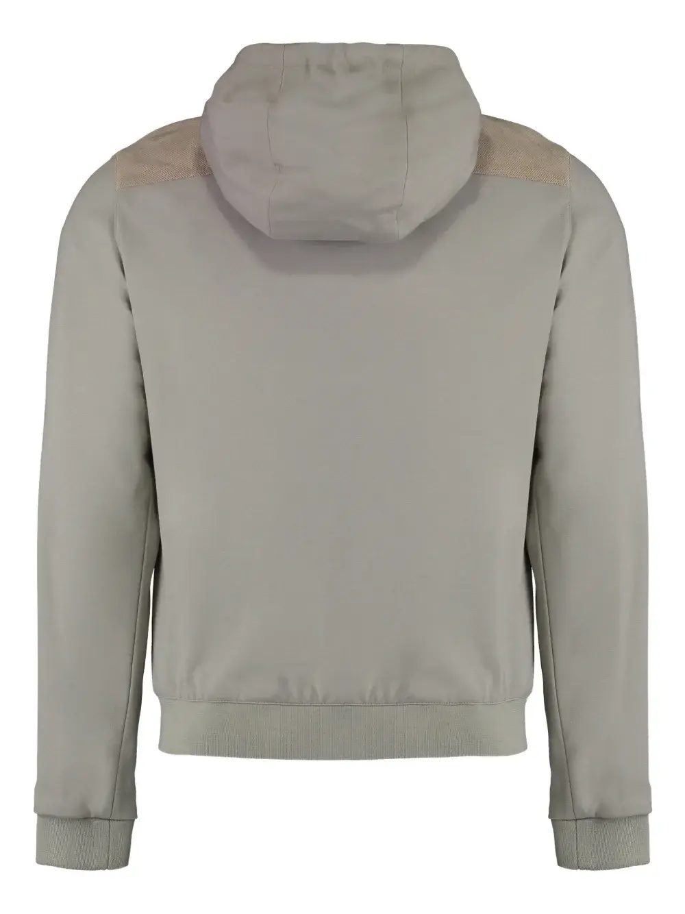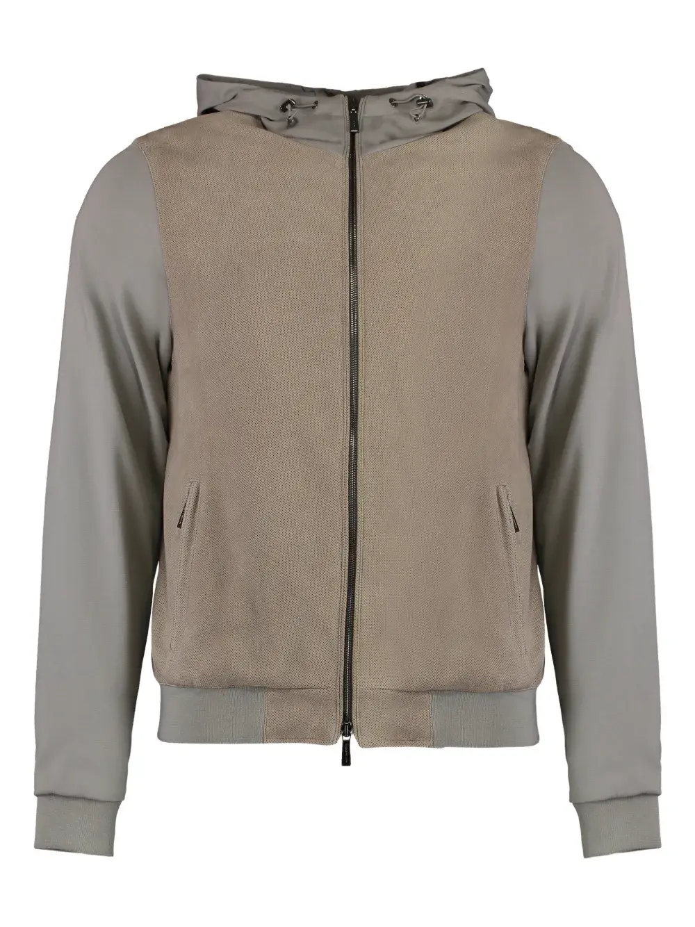 Бежево-серая контрастная передняя панель, два кармана на молнии, капюшон на завязках