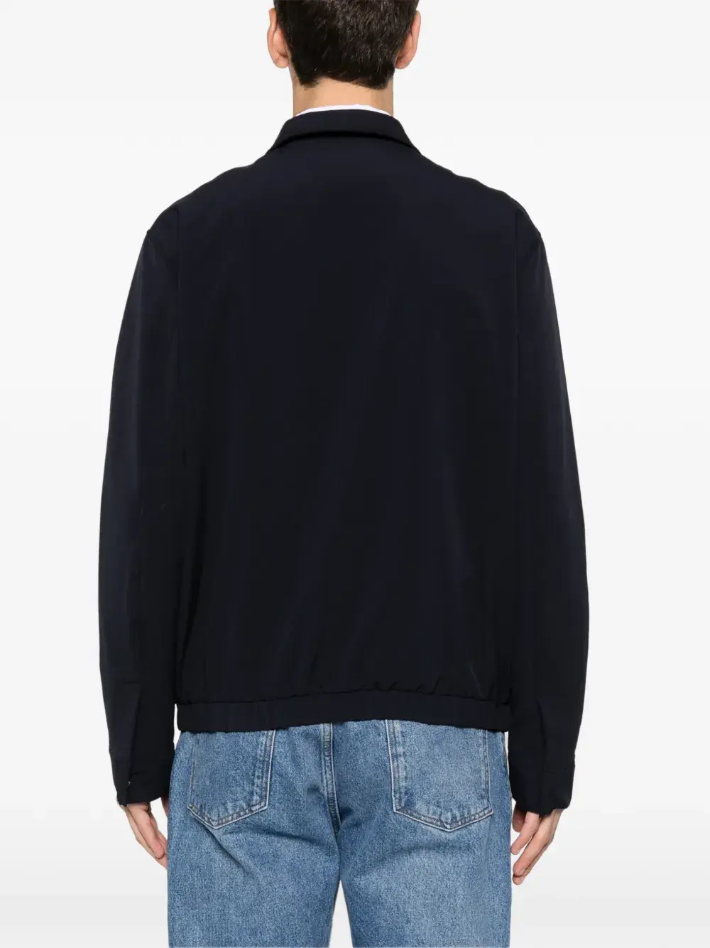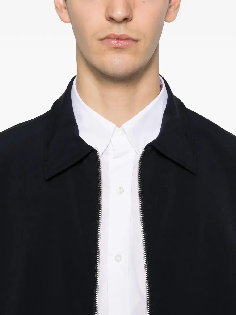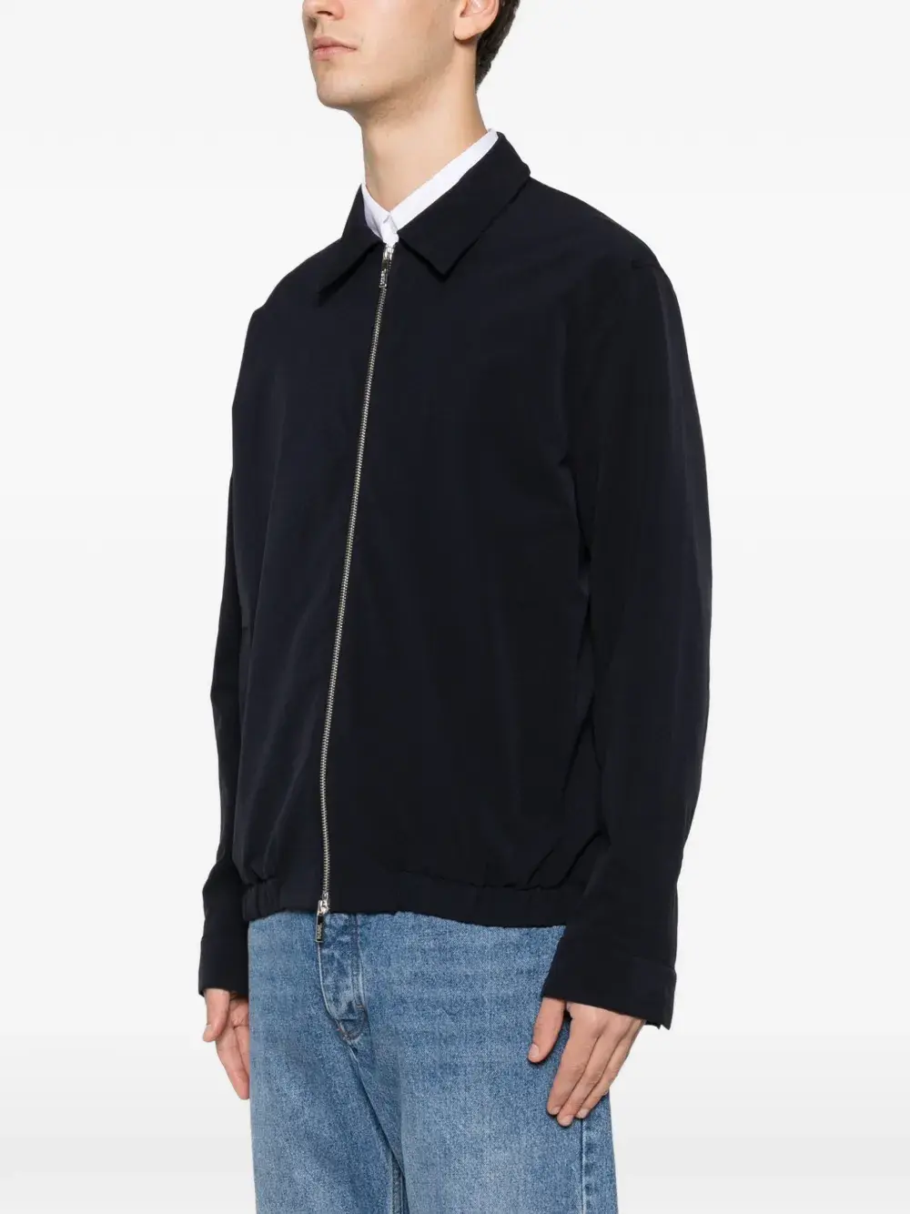 Темно-синий цвет, застежка-молния, воротник с острыми концами, длинные рукава, эластичный край, боковые прорезные карманы