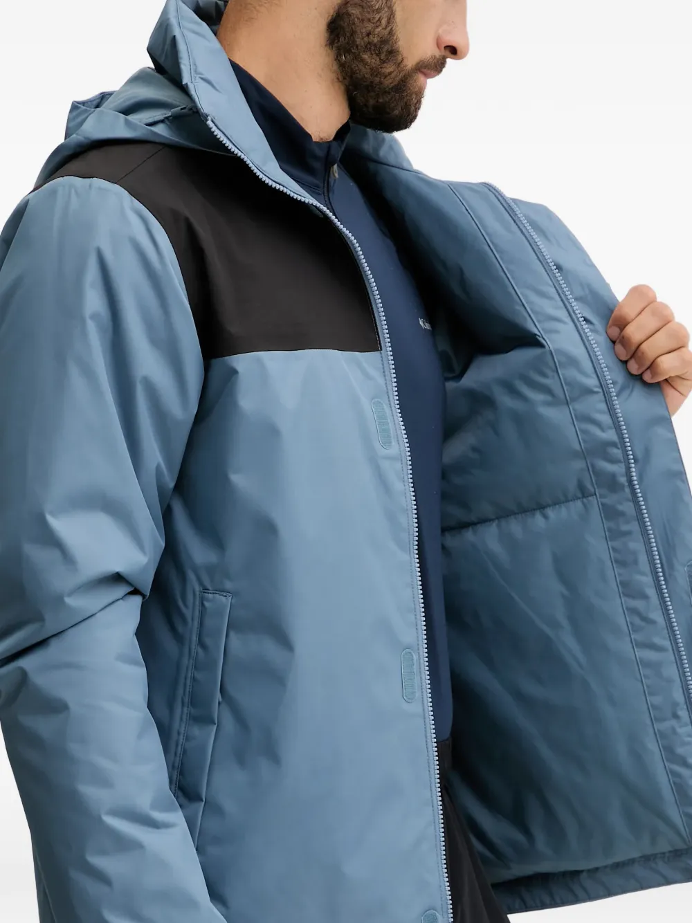 Светло-голубая куртка с панельным дизайном, капюшоном, застежкой-молнией, эластичными манжетами и карманами на молнии спереди