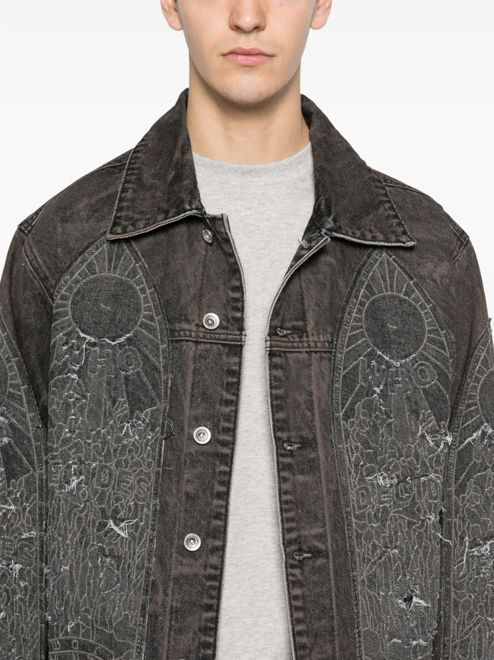 Тёмно-серый с графическим дизайном, застёжка на пуговицы, длинные рукава, боковые карманы