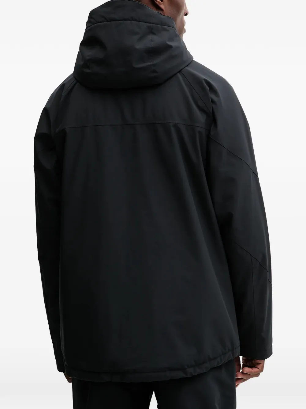 Чёрная куртка с капюшоном, застёжкой-молнией, логотипом, регулируемыми манжетами и множеством карманов
