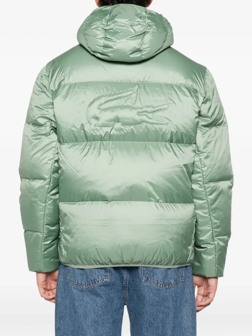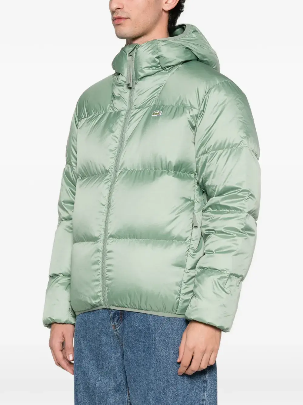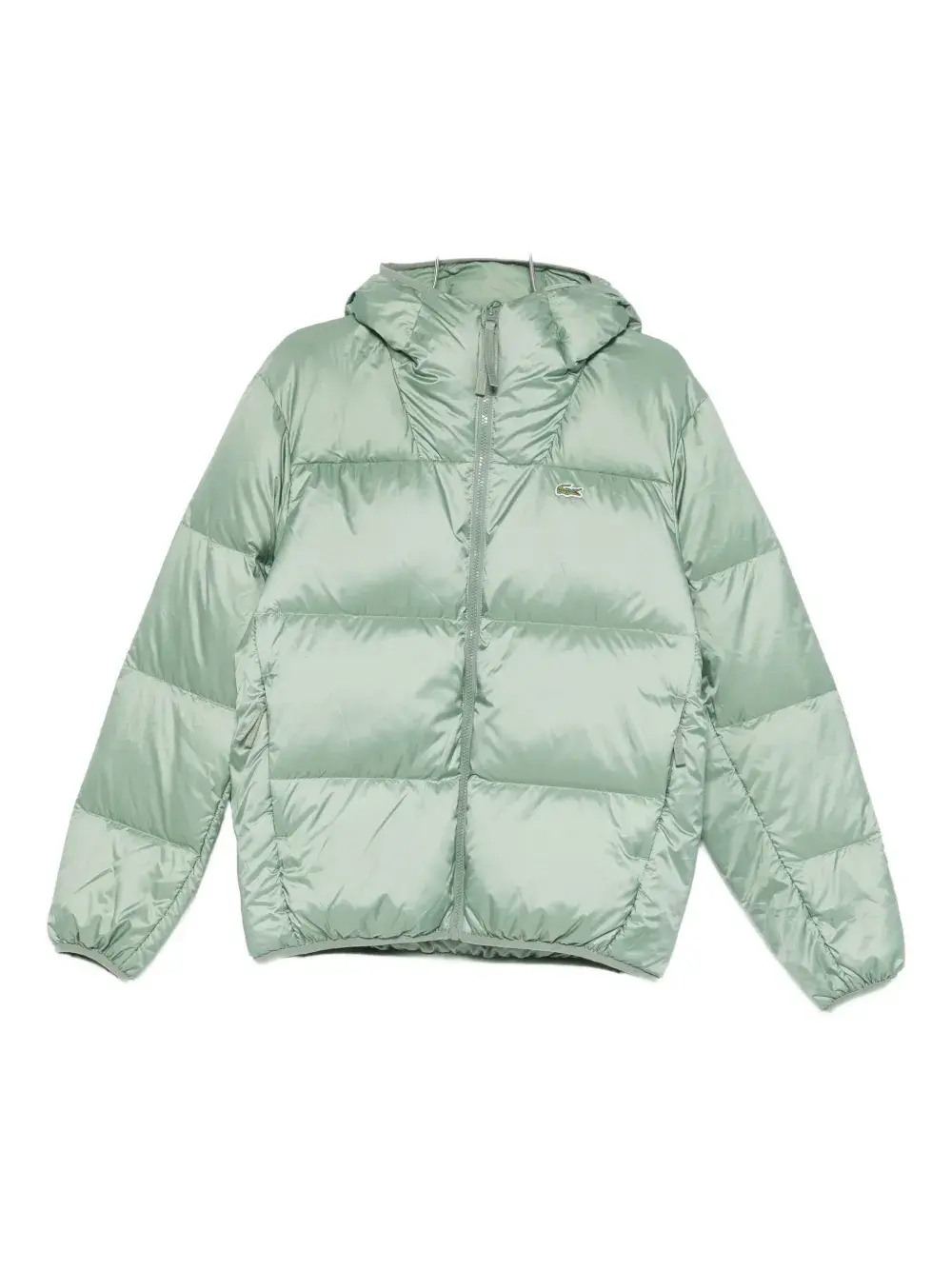 Светло-зеленая куртка с капюшоном, застежкой на молнии, логотипом, на резинке по нижнему краю, стёганая