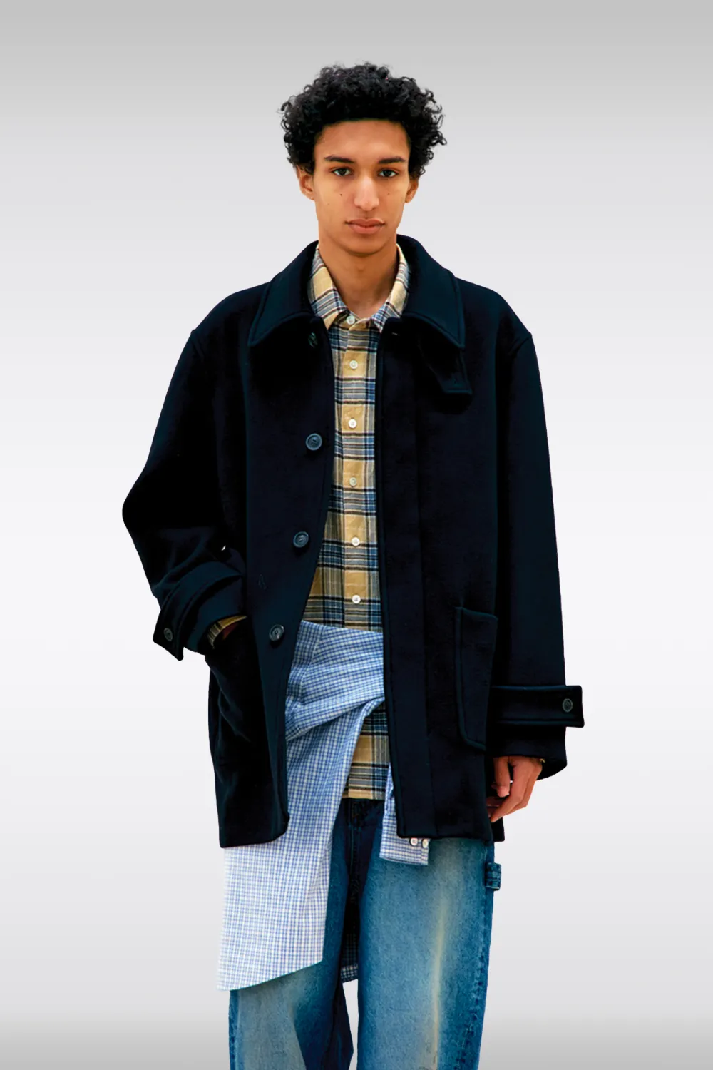 Черный отстегивающийся воротник, планка с деталями, застежка на пуговицы спереди, длинные рукава, накладные карманы, манжеты на пуговицах