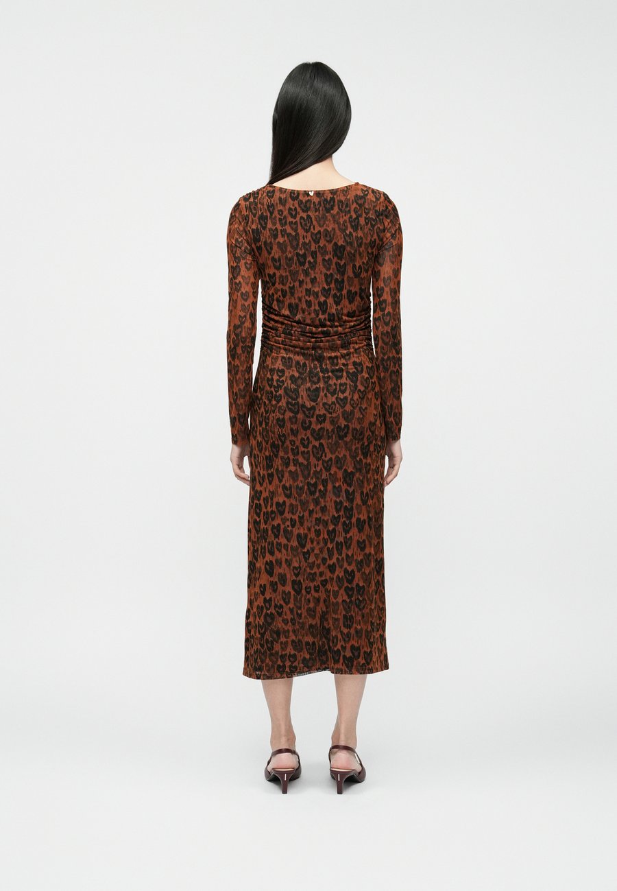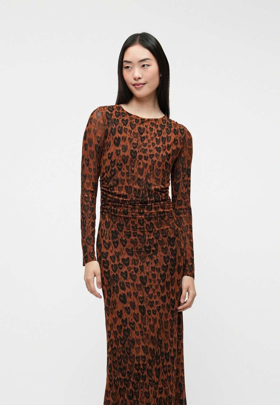 Это длинное сетчатое платье-макси украшено коричневым леопардовым принтом и имеет облегающий силуэт, подчеркивающий фигуру. Эта смелая, но элегантная вещь с женственным акцентом - с длинными рукавами и легкой, полупрозрачной отделкой. Вырез горловины: круглый.Материал и уход