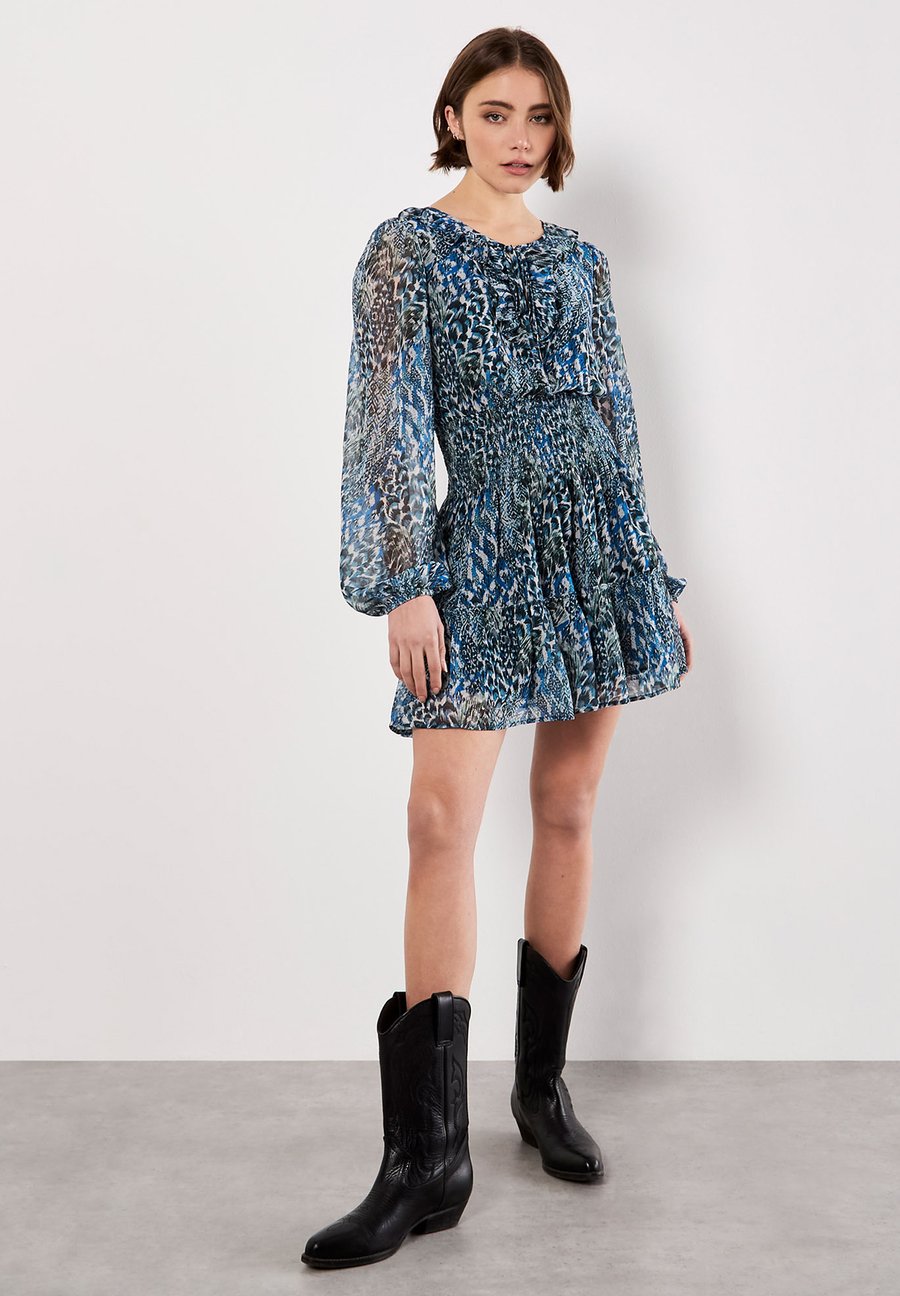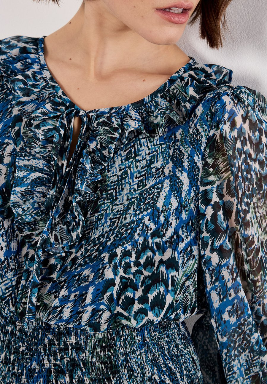 Прикоснитесь к стилю бохо с этим мини-платьем с принтом в виде перьев. Платье, сшитое из легкого шифона и имеющее подкладку для комфорта, отличается присборенной талией для привлекательной посадки, рукавами-фонариками и воротником с оборками и завязками. Вырез: КруглыйМатериал и уход
