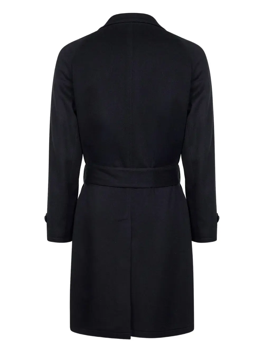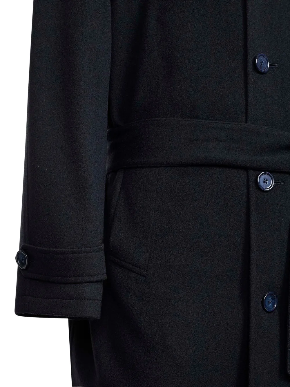 Темно-синий цвет, отложной воротник с выемкой, застежка на пуговицы, съемный пояс, прорезные карманы, центральный разрез