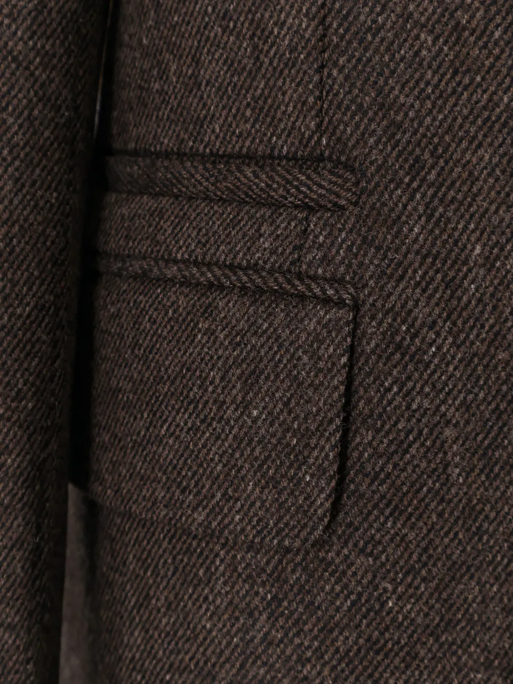 Коричневые заострённые лацканы, застёжка на пуговицы, клапанные карманы, длинные рукава