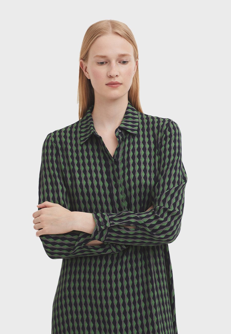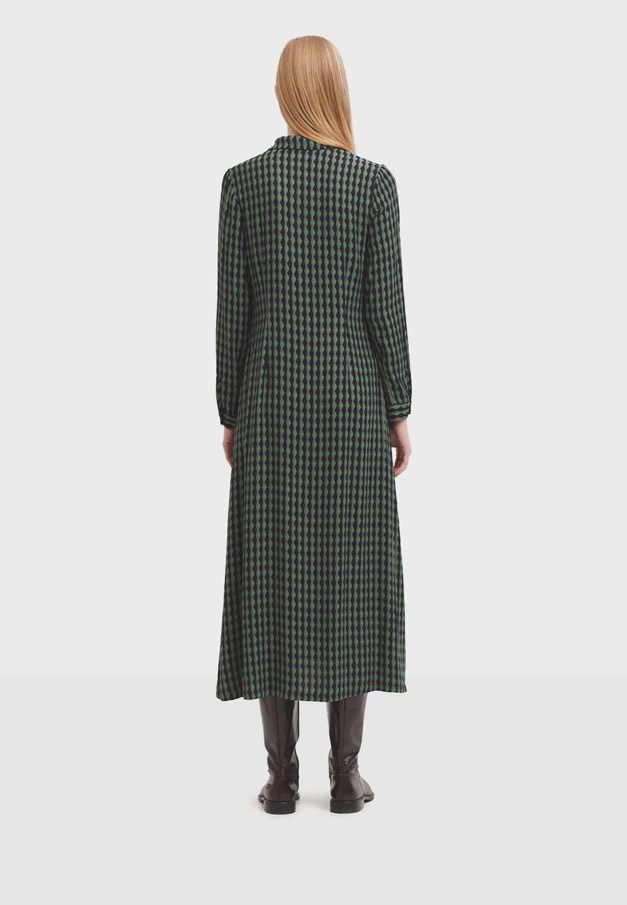Длинное платье свободного, струящегося кроя, из вискозного крепа с мягкой драпировкой. Эксклюзивный двухцветный геометрический узор. Тунисский вырез горловины с частичной застежкой на пуговицы. Длинные рукава с манжетами на пуговицах. Закругленный подол. Удобный фасон со смелым графическим дизайном. Вырез: КруглыйМатериал и уход