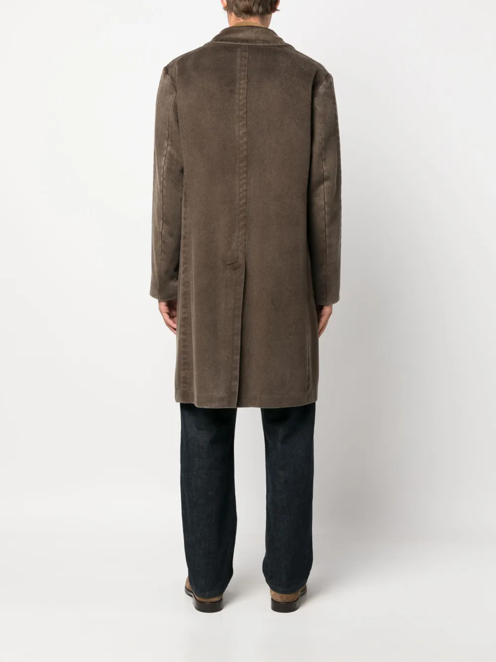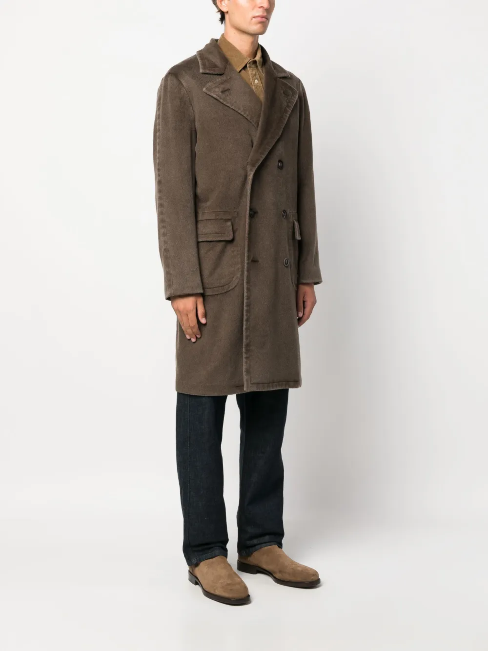 Коричневый, кашемир, зазубренные лацканы, двубортная застежка на кнопки, два передних кармана с клапанами, длинные рукава, манжеты на пуговицах, прямой подол, длина по колено и шлица по центру сзади.