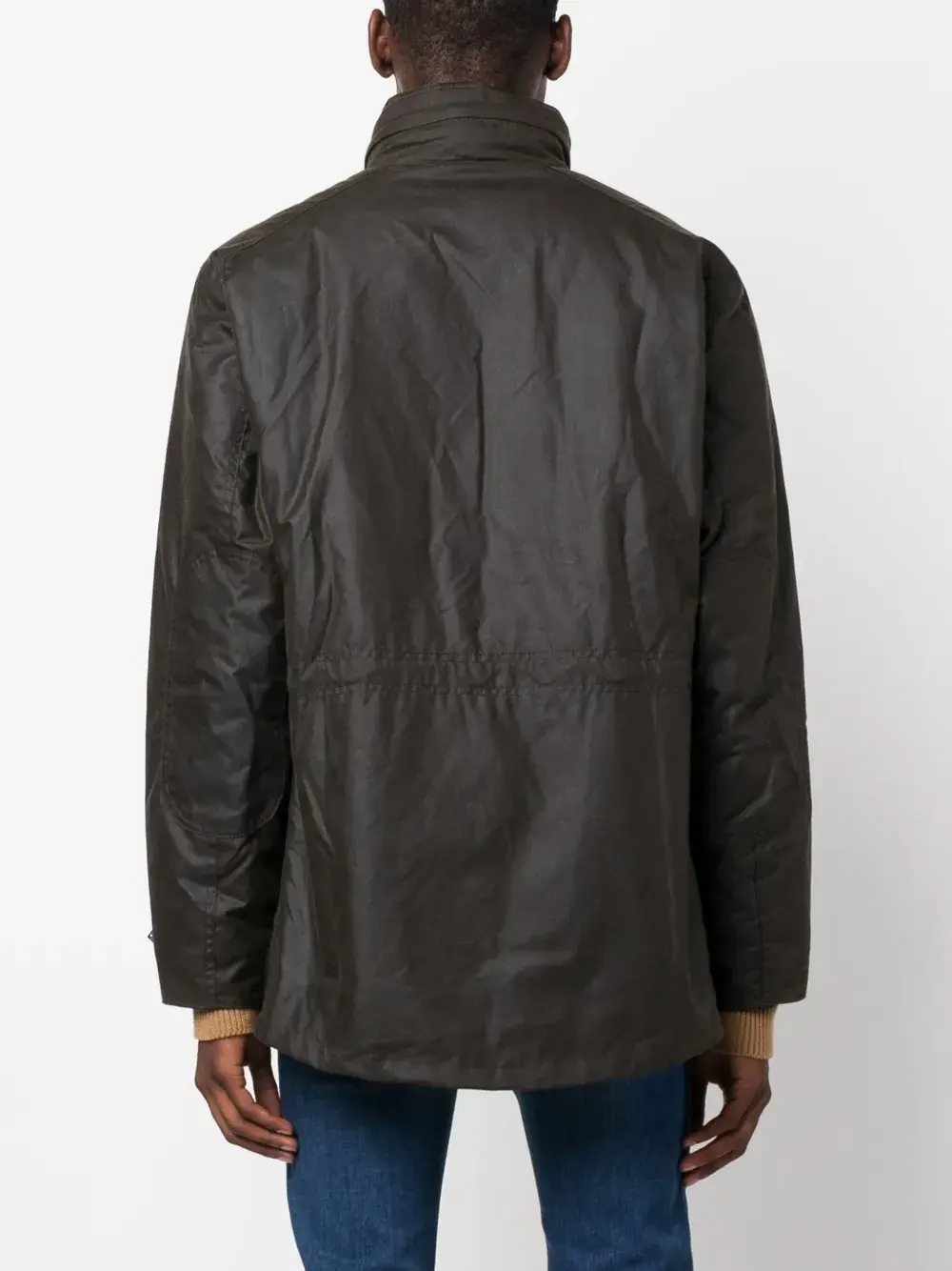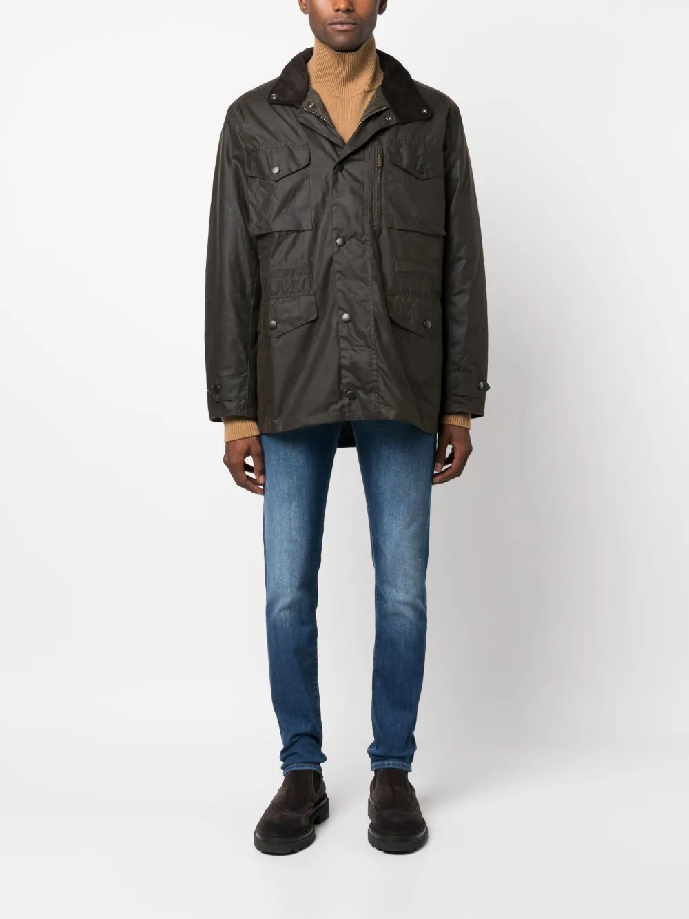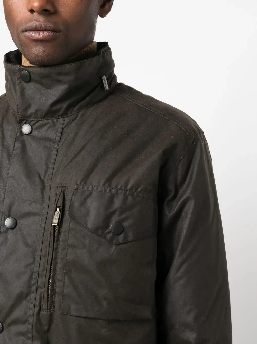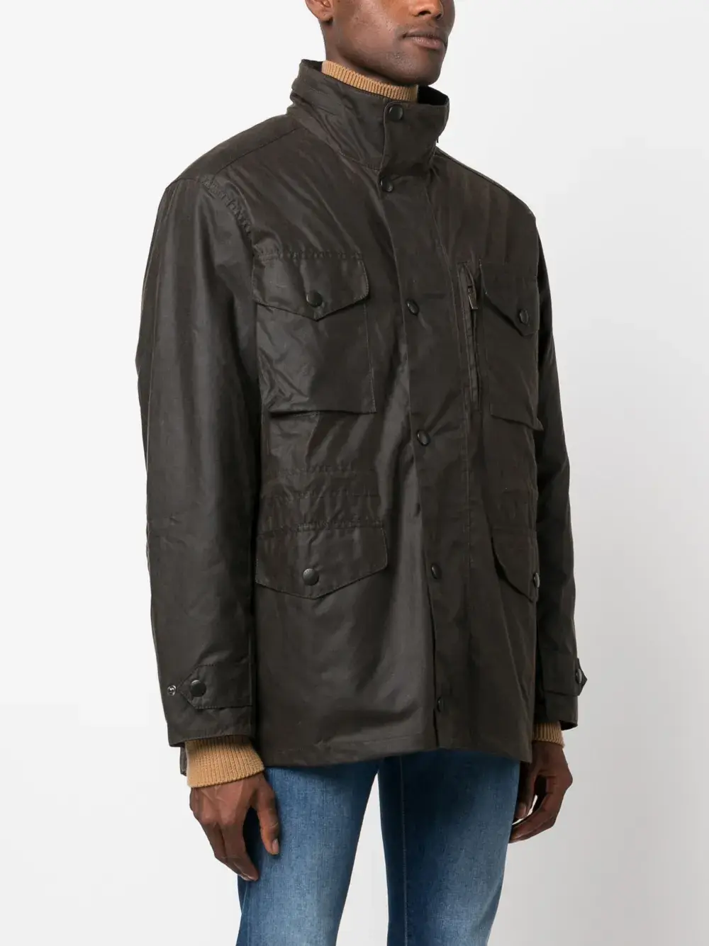 Зеленый, вощеный материал, высокий воротник, застежка на кнопках спереди, длинные рукава, четыре передних кармана с клапанами и прямой подол.