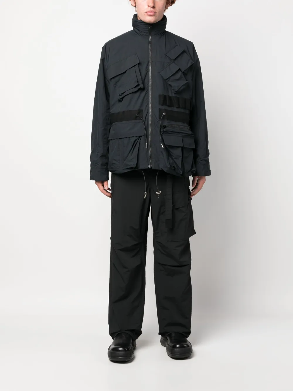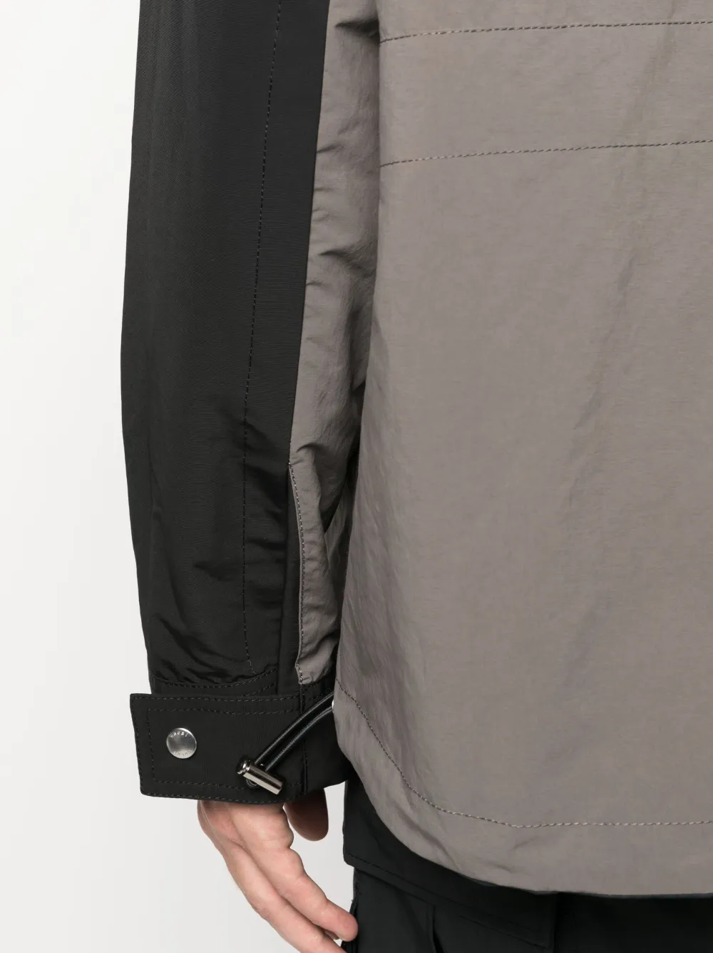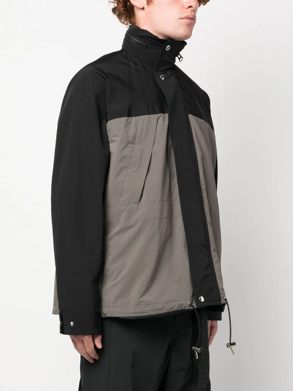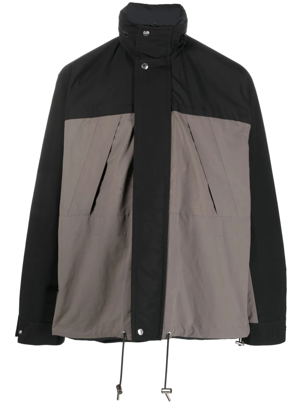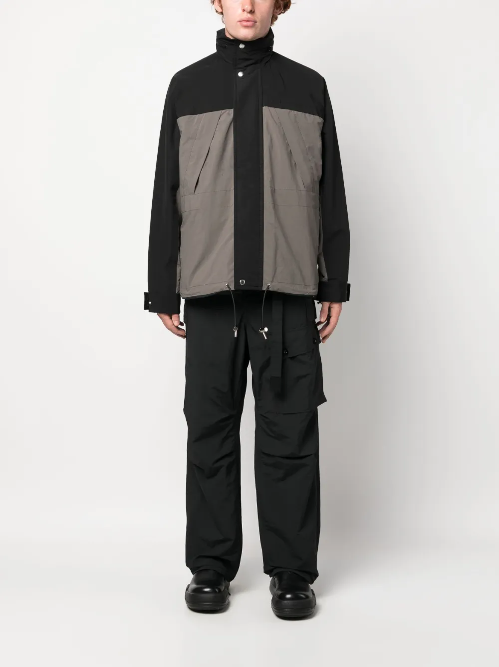 Серо-коричневый, черный, синий, смесовый хлопок, воротник-труба, двусторонний дизайн, потайная застежка спереди, длинные рукава, манжеты на пуговицах, два нагрудных кармана на молнии, прямой подол и подол с кулиской.