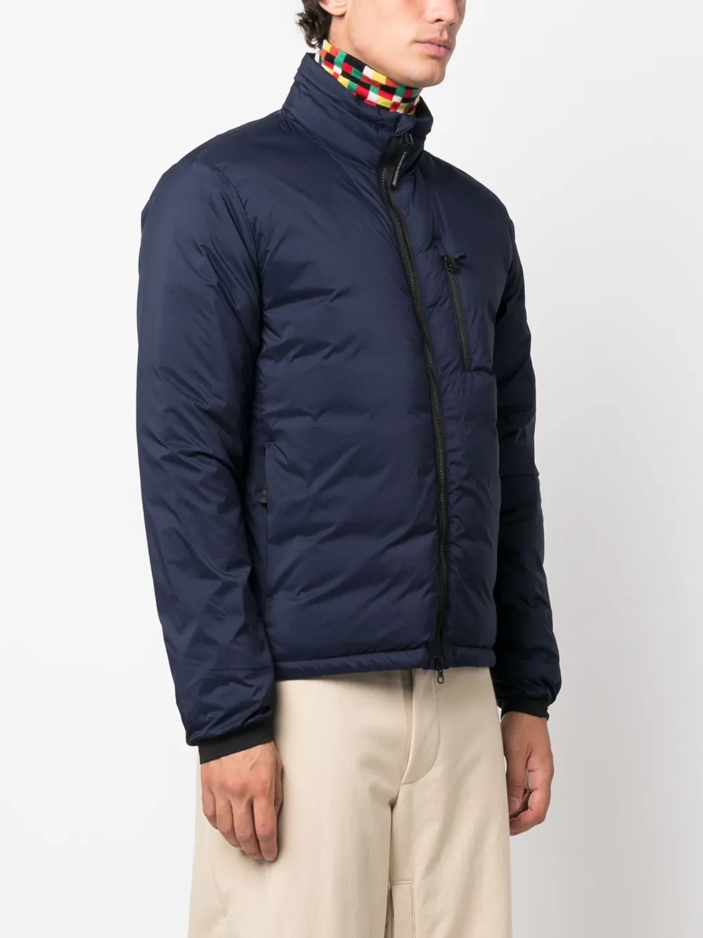 Темно-синий, наполнитель из пуха и перьев, дутый материал, водоотталкивающий материал, нашивка с логотипом на рукаве, съемный капюшон, воротник-стойка, двусторонняя молния спереди, длинные рукава, рукава с узкими манжетами, два кармана на молнии по бокам и прямой подол.
