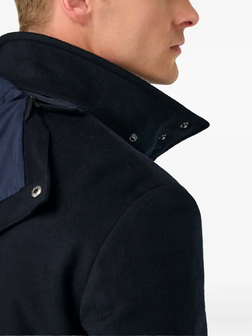 Темно-синий стеганый дизайн, съемный капюшон, застежка на кнопки, передние прорезные карманы с клапанами
