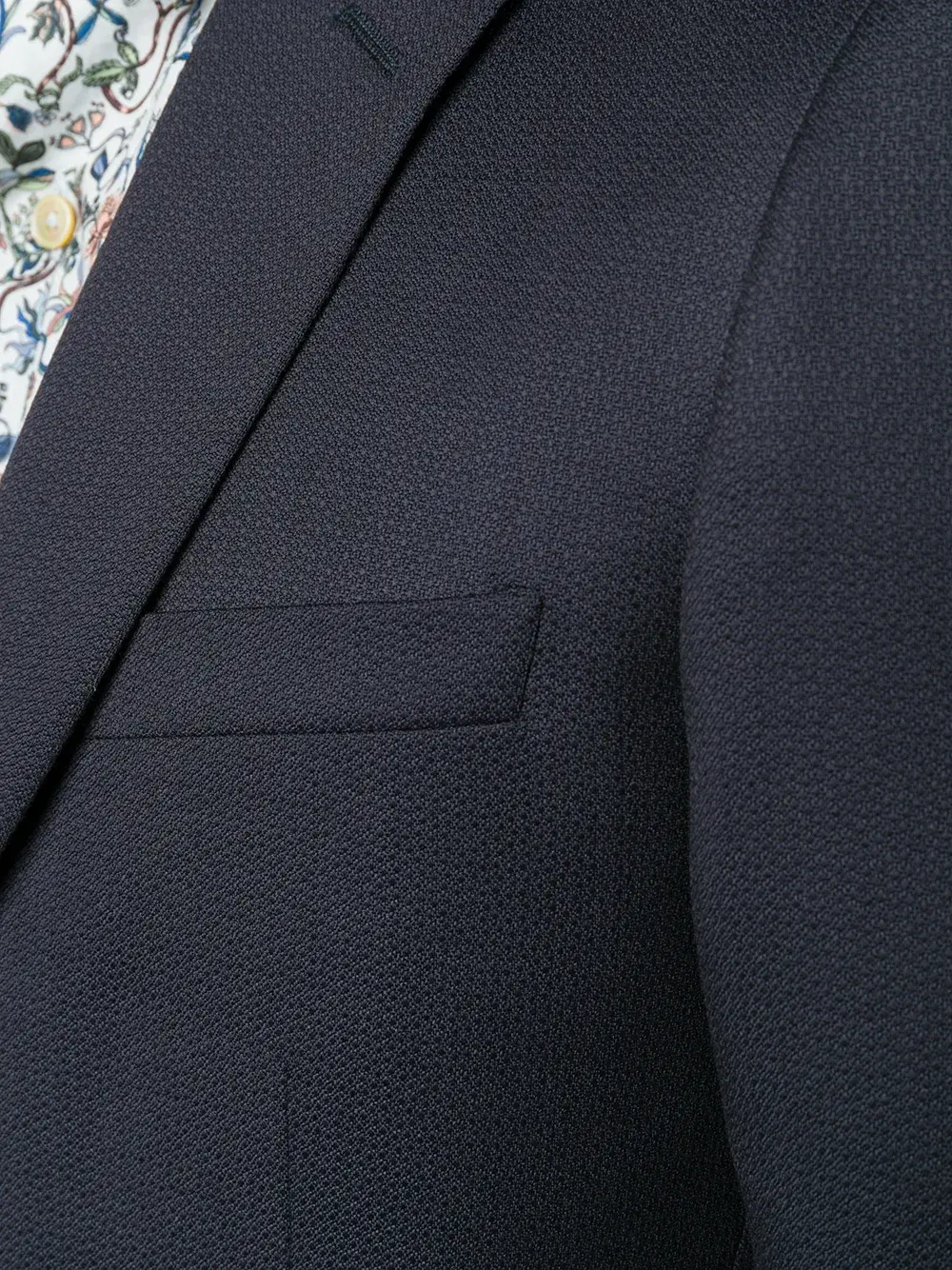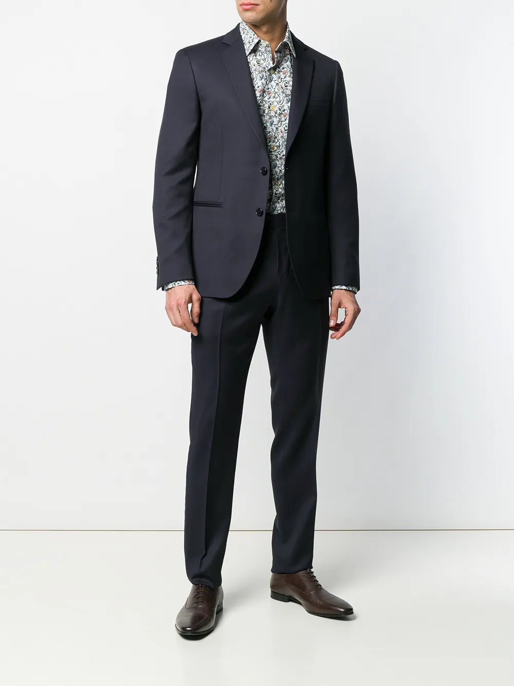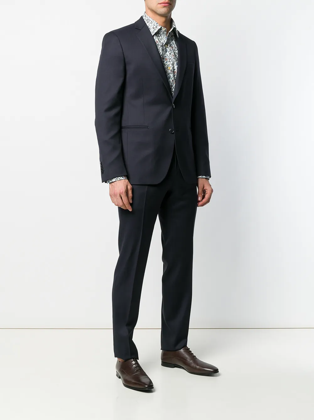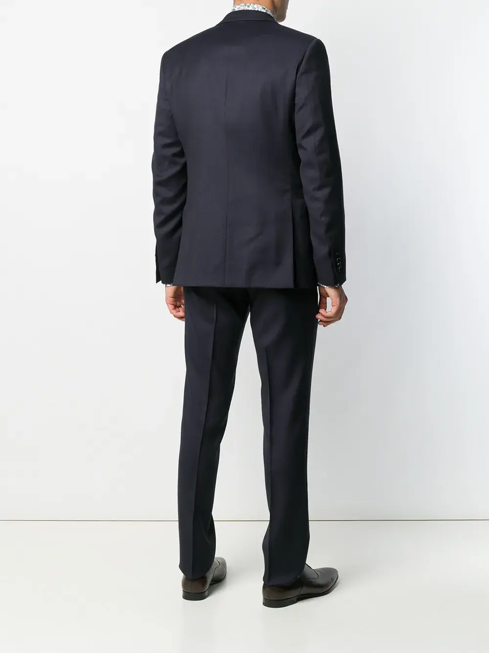 Костюм-двойка от Dell'oglio. Зазубренные лацканы, застежка на пуговицах спереди, длинные рукава, манжеты на пуговицах, нагрудный карман, два передних кармана, двойная шлица сзади, пояс с петлями для ремня, застежка спереди, боковые карманы, задние карманы с листочкой на пуговицах, прямые брючины и стандартная длина.