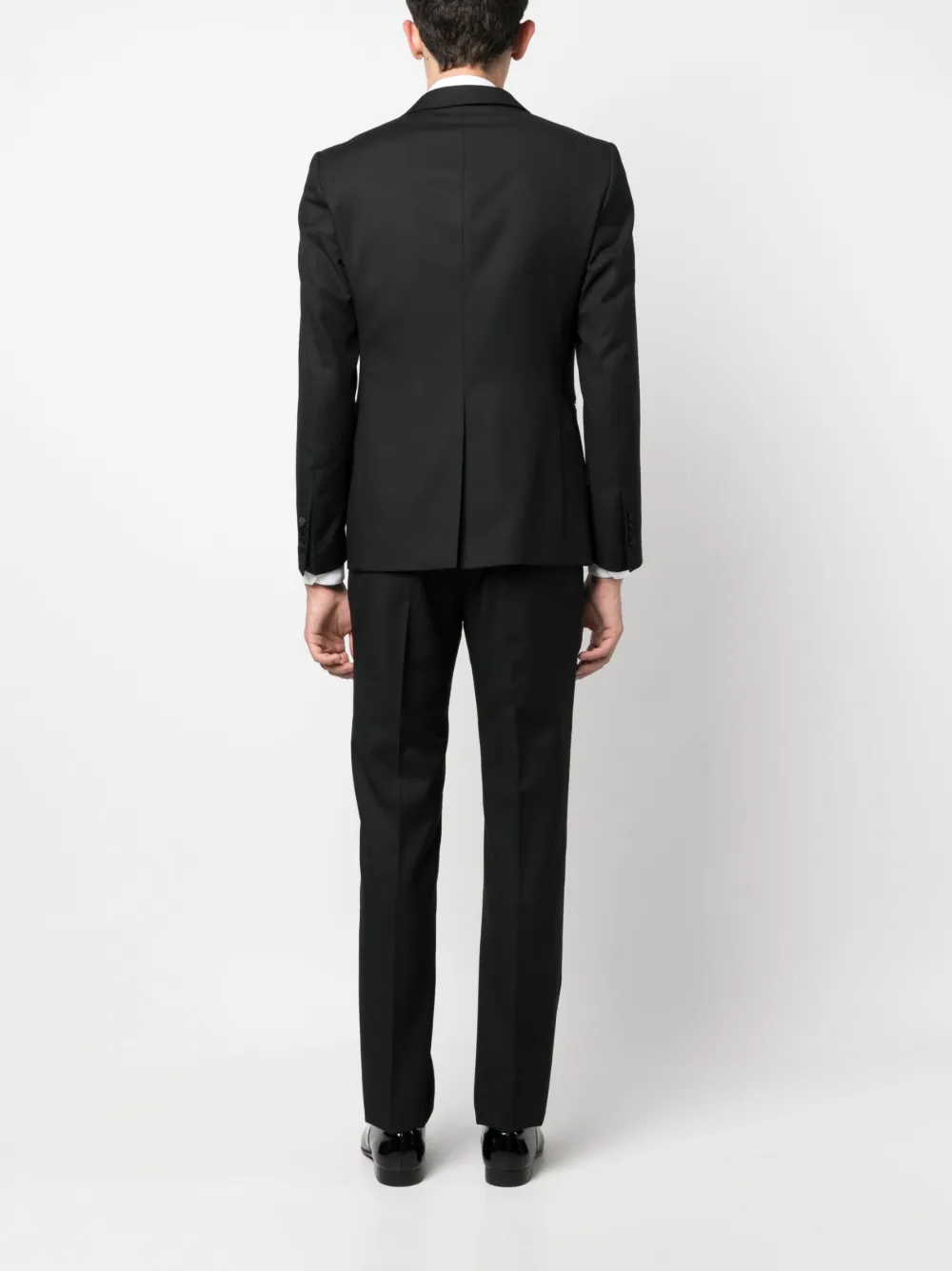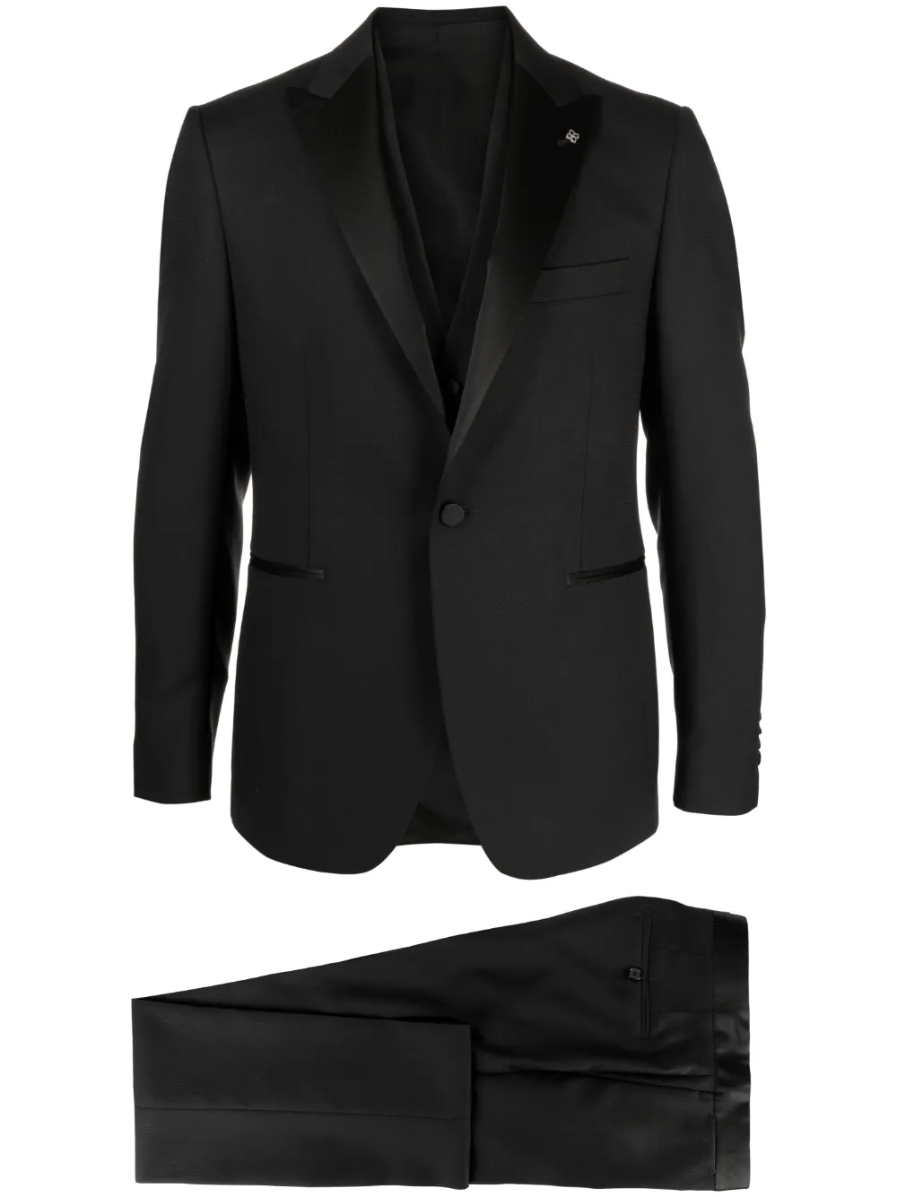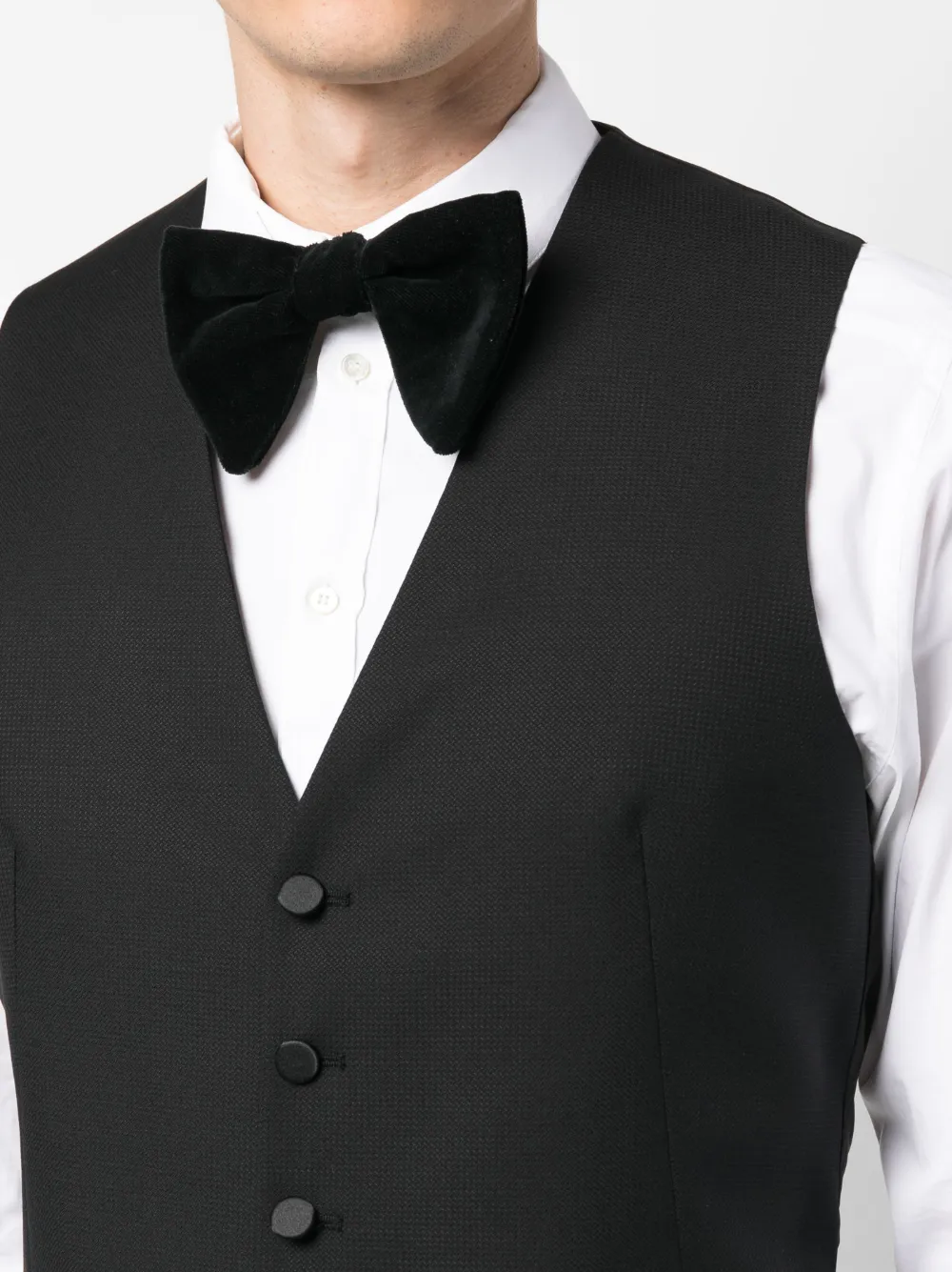 Черный, смесь необработанной шерсти и шелка, подвеска с логотипом, заостренные лацканы, шлица по центру сзади, застежка на пуговицах спереди, прорезной карман на груди, два передних кармана с листочкой, длинные рукава, манжеты на пуговицах, V-образный вырез, застежка на пуговицах спереди, без рукавов, петли для ремня, застежка на молнии и пуговице спереди, два прорезных кармана по бокам, два прорезных кармана на пуговицах сзади и узкий крой.